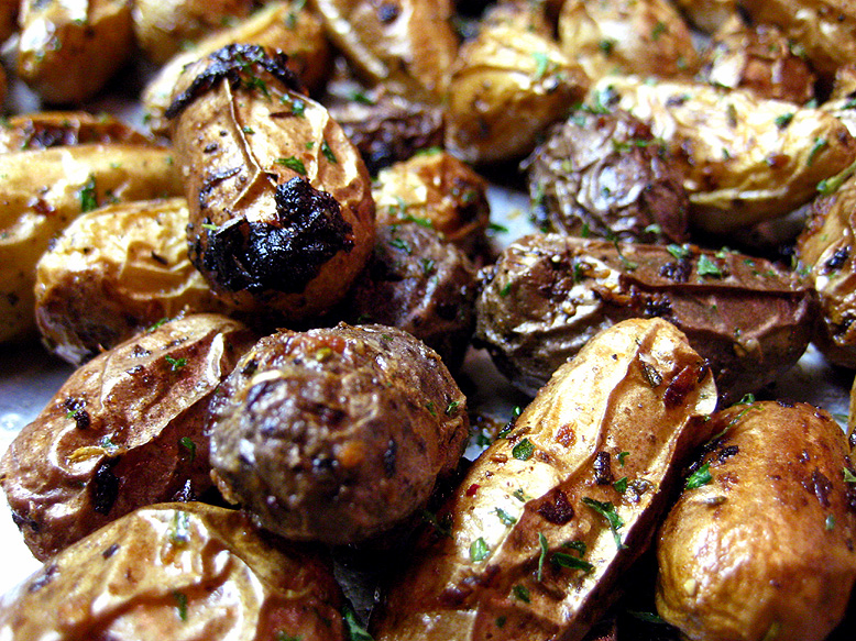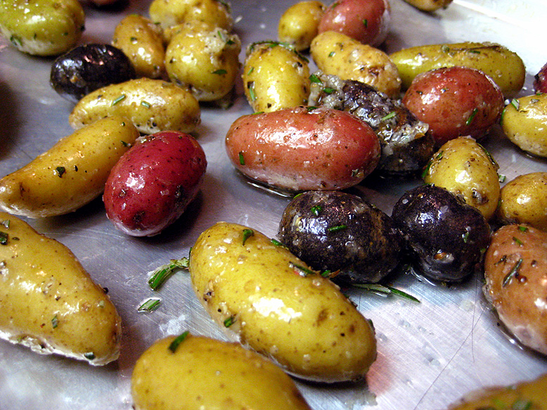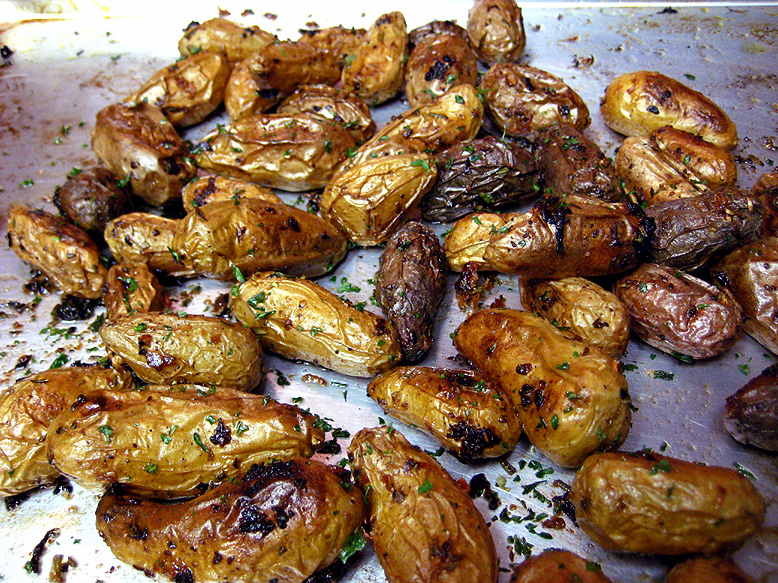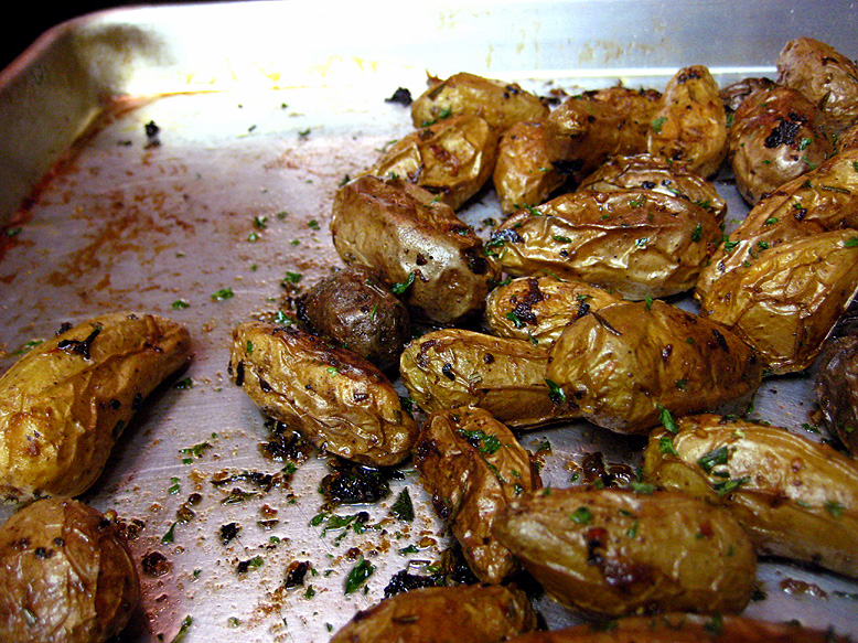 These little taters are very simple to prepare and will do just fine left to their own devices in a hot oven while you prepare the rest of dinner on the stove. They are excellent with roast chicken, and would be equally welcome with a good steak and a simple salad. My favorite accompaniment for these guys? Just a bowl and a fork, thank-you-very-much.