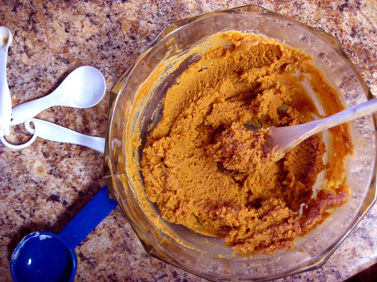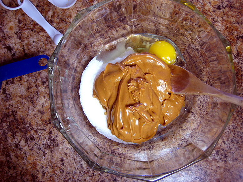 In a large bowl, mix together the sugar, vanilla, salt, egg and baking soda until smooth. Stir in the peanut butter with a wooden spoon. It will look too runny at first, but keep on stirring, and poof! The mixture will magically form a stiff dough. Science, bitches. It works.