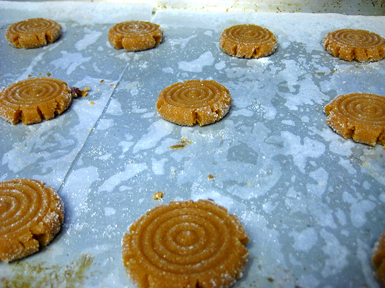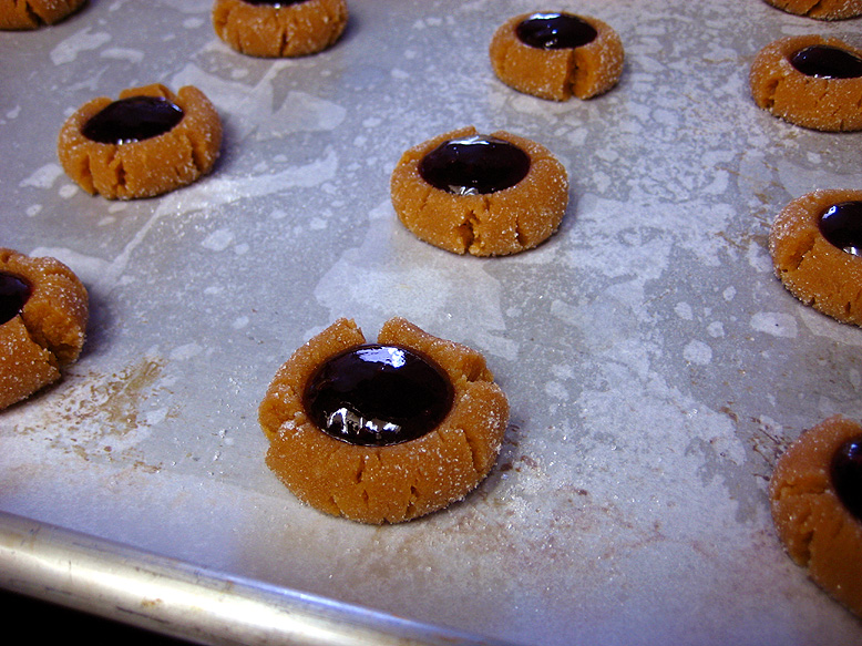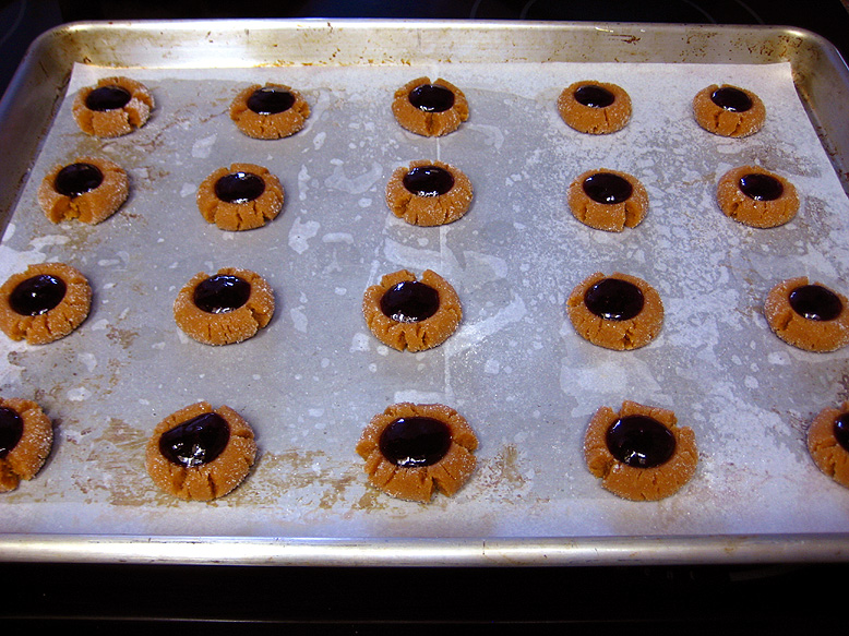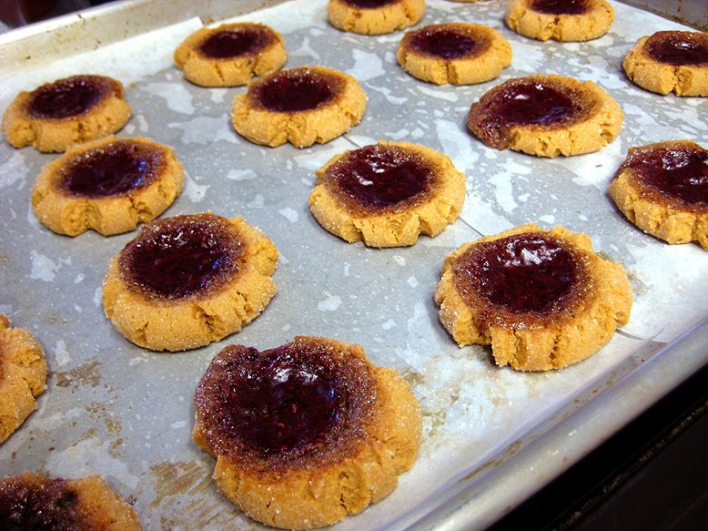 Once all your cookies are filled (or just flattened, if you didn’t want to fill them), pop them into your preheated oven and bake ’em. I was actually using the convection setting on my oven, which will probably alter the baking time versus a non-convection oven. Mine baked for 18-20 minutes, but if you’re not using a convection oven you might want to start them out around 12 minutes and see how far that gets you. The cookies will still seem a bit soft when they’re done (if you press them, they will sink some), but they’ll firm up more as they cool. Just aim for light golden brown and dry-looking on the edges and you should be in good shape. The little jammies are quite fragile when warm, so they can cool on the sheet pan before they get removed.