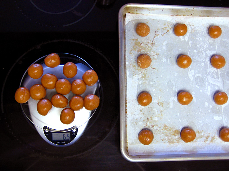 At this point, I busted out my trusty kitchen scale and rolled out little dough balls. I weighed mine at 1/2 an ounce each, or 14 grams. I’d guess they were slightly smaller than one tablespoon, but I didn’t really measure this so don’t quote me on it. Once the little dough balls are all weighed, put a few more tablespoons of white sugar into a bowl and roll around a few of the dough balls at a time until they’re fully coated. Place the dough balls on your lined sheet pans, about an inch or two apart. These don’t spread a whole lot, but I just like to have extra insurance that they wont run into each other and look all goofy. I was able to fit 20 on one pan without any problems.