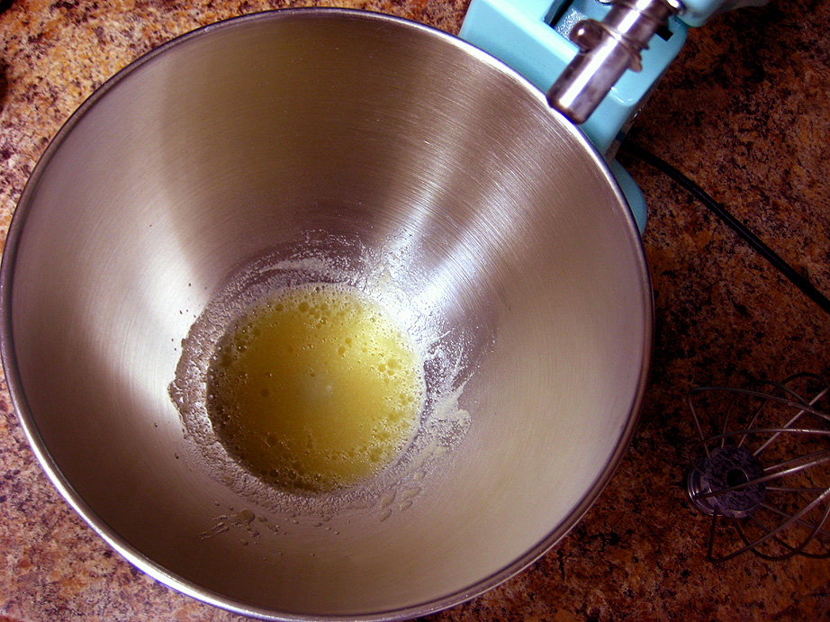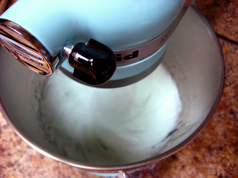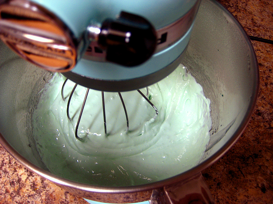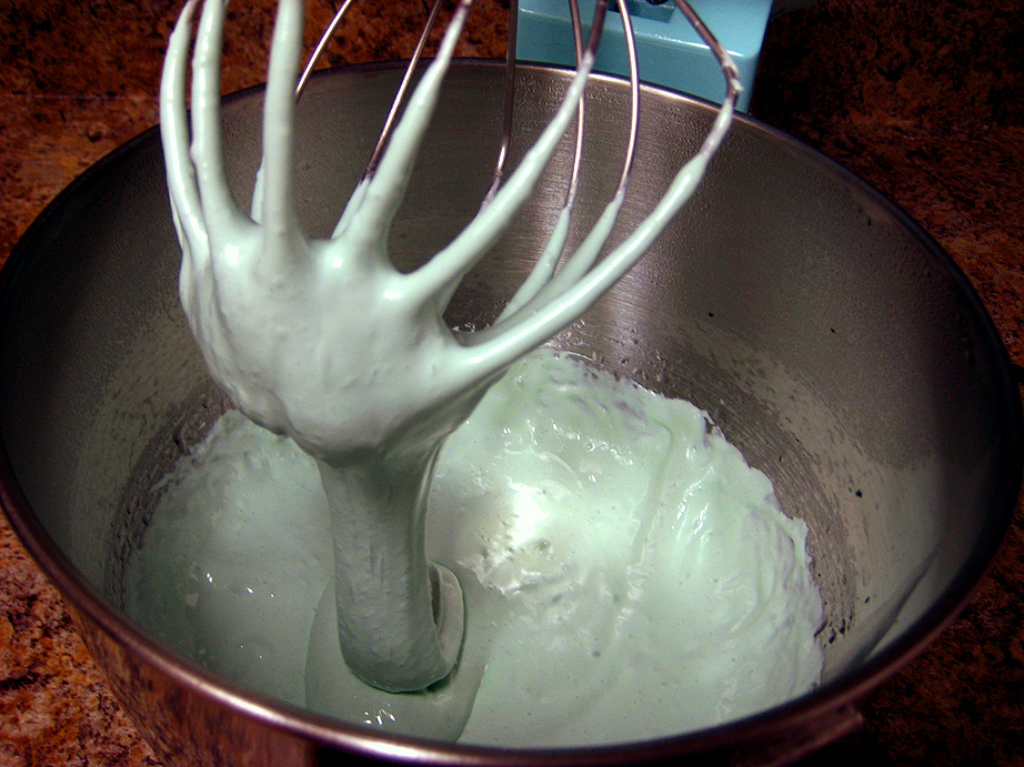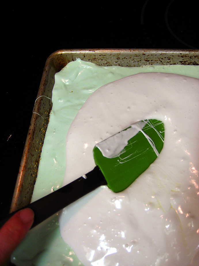 Once the syrup reaches 240, immediately take off the heat and turn on the mixer with the whip attachment in place. Slowly pour the super hot syrup down the side of the bowl into the gelatin mixture, while the mixer is running on low. Once all the syrup is in the bowl, add the lime oil and the green coloring and crank the mixer up to high speed and let it whip up the marshmallow for about 3-4 minutes. The marshmallow will still be quite runny at this point. With an oiled spatula, scrape out the lime marshmallow into the crumb-lined pan and gently spread it out to the edges. Don’t worry too much if it’s not completely flat. Be careful about using too much oil on the spatula, if the top of the lime layer is too greasy, the vanilla layer won’t adhere to it. Set the pan aside while you make the vanilla layer. Wash out the mixer bowl, whip attachment and spatula to get them ready for the vanilla layer. There’s no need to wash out the syrup pan, just proceed with the next layer.
