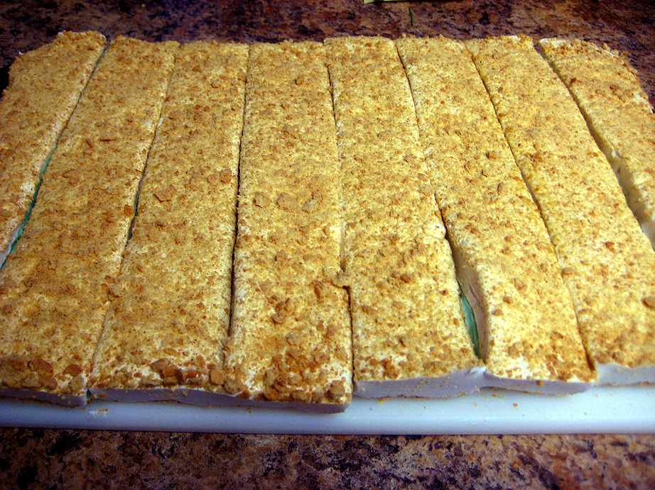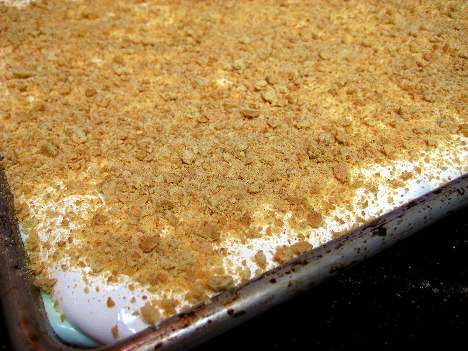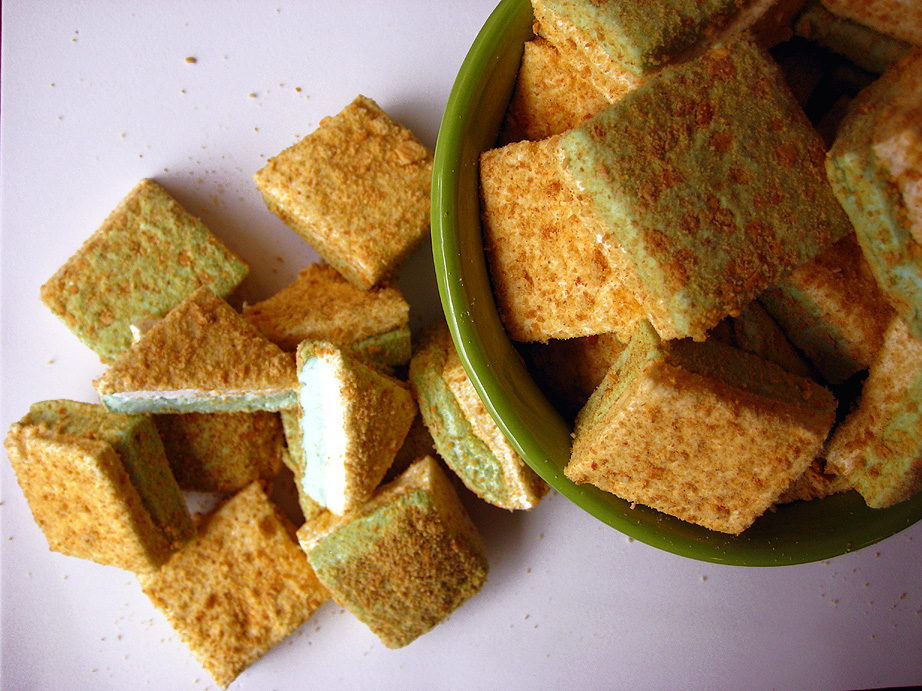For the vanilla layer, repeat the steps for making the lime layer, except use 1/4 cup of cold water in place of the lime juice for blooming the gelatin, and 1/4 cup water in the sugar syrup. Once the syrup comes off the heat, add it to the bloomed gelatin just as you did for the lime layer, and add the vanilla extract before turning the mixer to high. Beat on high for 3 to 4 minutes and scrape out the vanilla marshmallow with an oiled spatula and pour it evenly on the lime layer. Spread it carefully to cover the surface of the lime layer. Sprinkle on 1/3 cup more of the graham cracker crumbs, saving the excess crumbs to roll the marshmallows in later. Set the pan aside, loosely covered with plastic wrap, at room temperature for several hours or overnight.