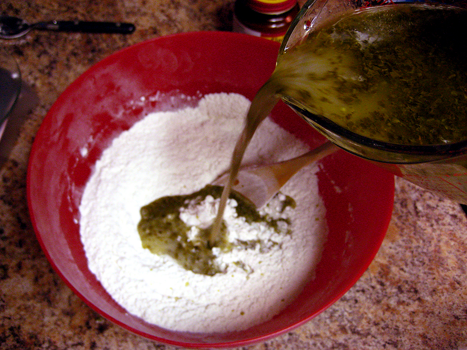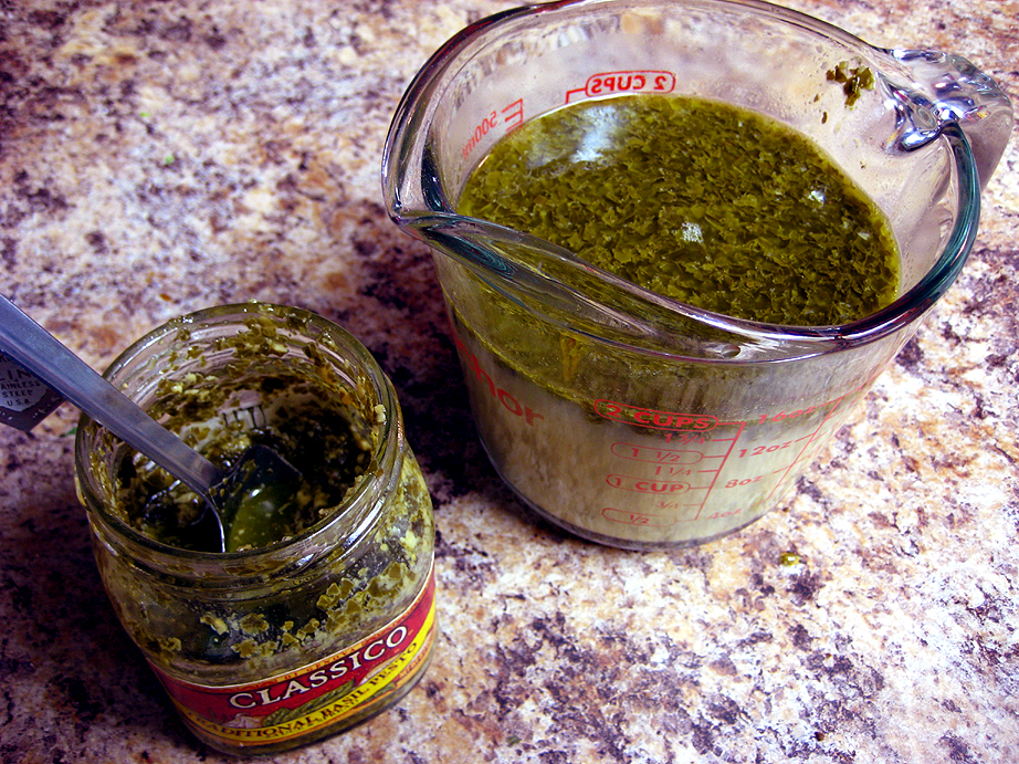 The recipe that I started with was actually sort of a variation on the classic No-Knead dough recipe, which I found on another blog. It’s essentially the same as Lahey’s version, but even lazier, if you can imagine! This version skips the second rising time, and the bread that results is still airy, chewy and with a fantastic crust I previously thought only possible from a good bakery. The first time I made this bread, I added chopped green chiles and a hefty amount of sharp cheddar cheese. It was quite fantastic, and I hope to make it again sometime soon. This time was the third time I made this awesome bread, and I had a jar of pesto languishing in my pantry and figured that this bread would be the perfect vehicle for it.