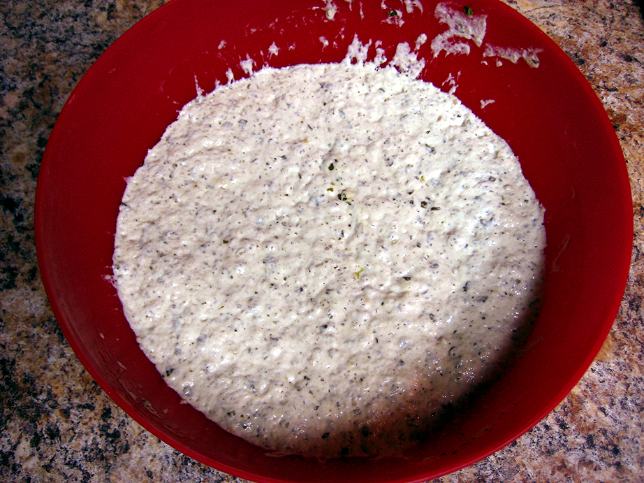 In a large bowl, mix your flour, salt and pepper. Stir with a wooden spoon until everything is well incorporated. In a liquid measuring cup, measure out your water, and stir in the yeast with a fork. It will take a few minutes, but the yeast will dissolve. Stir in the pesto and pour this whole mixture into the flour bowl. With the wooden spoon, stir the dough until it comes together. It’ll be pretty soft, but don’t let that alarm you! Cover the bowl tightly with plastic wrap, and leave on the counter at room temperature where it will not get disturbed, for 12-24 hours. I think that 12-18 hours is optimal, but I’ve let mine sit for 24 hours if I’m otherwise occupied and can’t get to it in time.