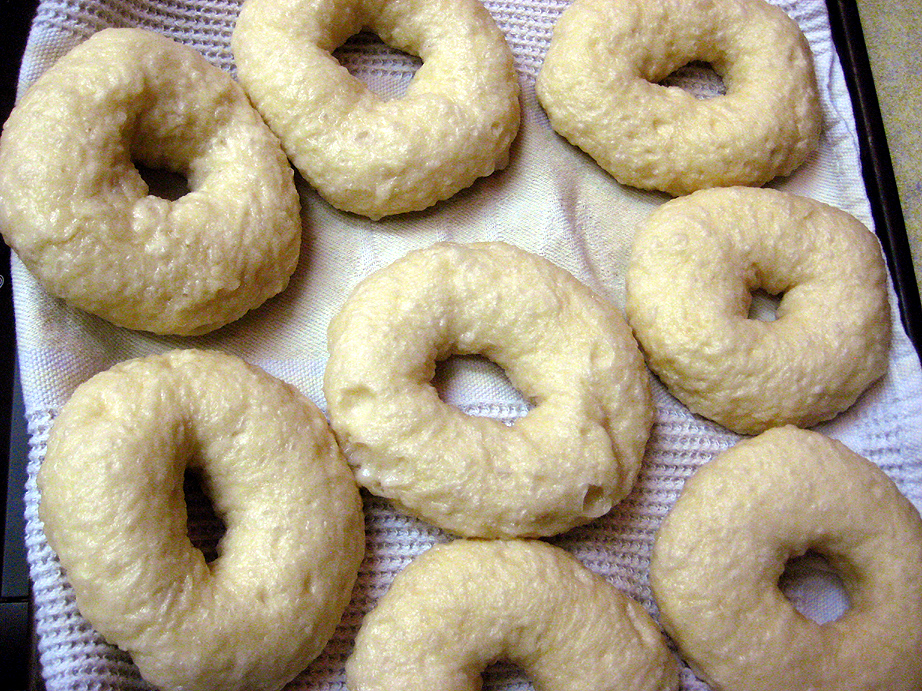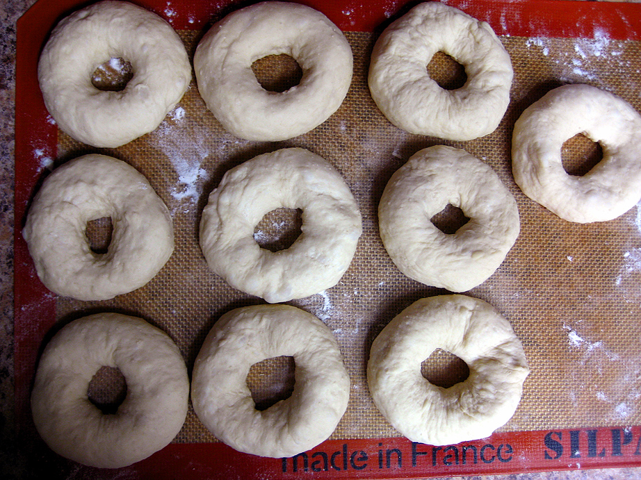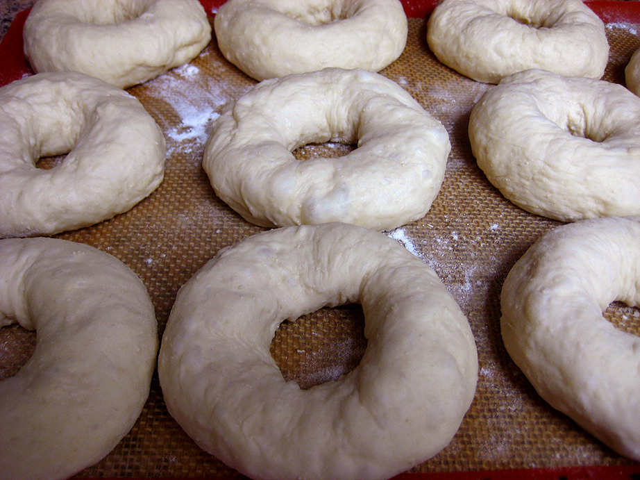 Once you’ve got the bagel portions weighed out, it’s bagel-shaping time! Ball up each portion of dough and make a hole in the center of each ball with your thumb, going through to the other side. You can use your fingers to stretch out the center, or put the ring of dough on your index finger and sort of hula-hoop it around to enlarge the center. Just be careful that the bagel doesn’t fly off your finger! The centers of the shaped bagels will tend to tighten up again because of the dough’s high gluten, so stretch them bigger than you think they should be. If the bagel comes out sort of irregularly-shaped after this step, you can squeeze the dough around to even it out. Place all 10 formed bagels on your lightly floured surface and cover them lightly with plastic wrap. Let the bagels rise and rest for 10 minutes.