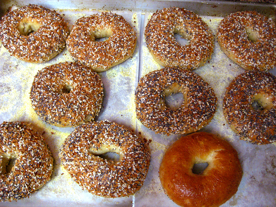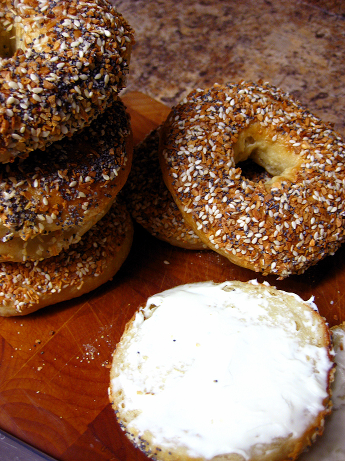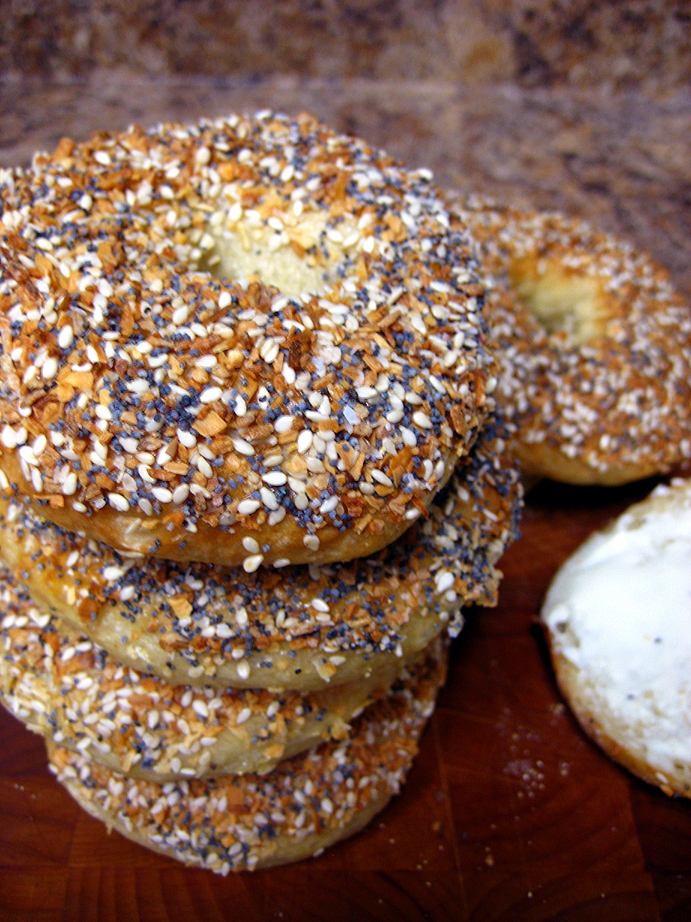 A long time ago, like 10+ years ago, I attempted to make some homemade bagels. I remember virtually nothing about them except that I found the process slightly tedious and annoying. I’ve always loved bagels, but up to now, I’ve been content to just buy them from places like Einstein’s and the like. There’s nothing really wrong with their bagels, they’re just not spectacular. Don’t even get me started on the crap “bagels” that you can buy in most grocery store bread aisles. They’re essentially dense hamburger buns with holes in the middle. Where’s the chewiness? Where’s the good crust?