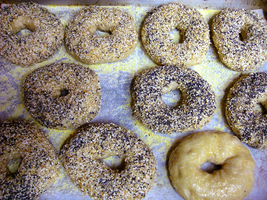 After the 10 minutes, your water should be at a full rolling boil. Gently pick up a bagel at a time and boil them for 30 seconds, making sure to boil no more than three at a time together. When 30 seconds are up, flip the bagels over with a slotted spoon and boil them for 30 seconds more. On a large plate or another sheet pan, place a lint-free kitchen towel (no terry cloth, it’ll pick up lint) and fish out the bagels with your slotted spoon, placing them on the towel to drain while you boil three more bagels. Once all the bagels are boiled, brush the tops with the egg wash. If you’re making the Everything bagels, throw together your topping ingredients into a shallow bowl or plate and drop the bagels egg-side down into the mixture. Swirl them around a bit to fully coat the tops, and place topping-side up on your cornmeal-covered sheet pan. Repeat with the remaining bagels. If you’re making the Jalapeño-Cheddar bagels, lay the egg-washed jalapeño bagels onto their sheet pan and sprinkle the grated cheese on top of each bagel, about half an ounce per bagel.