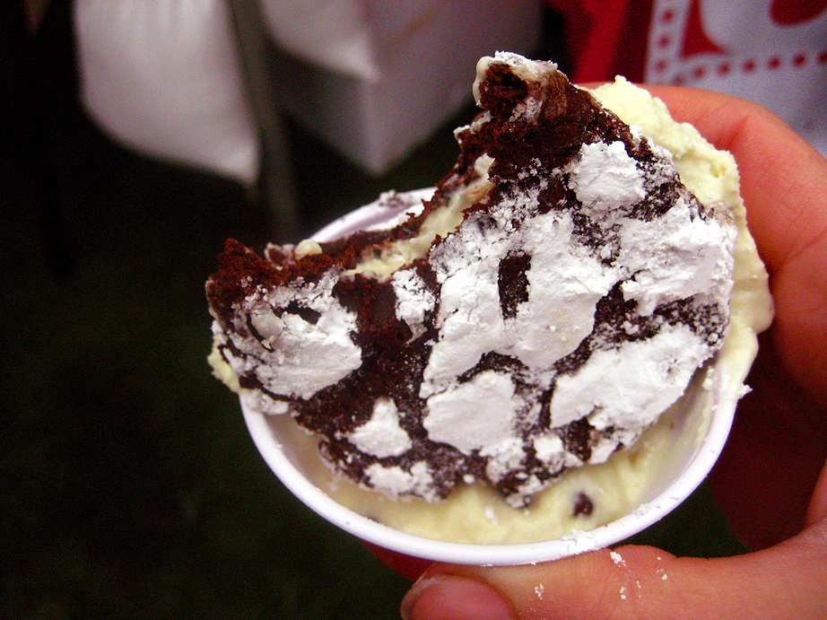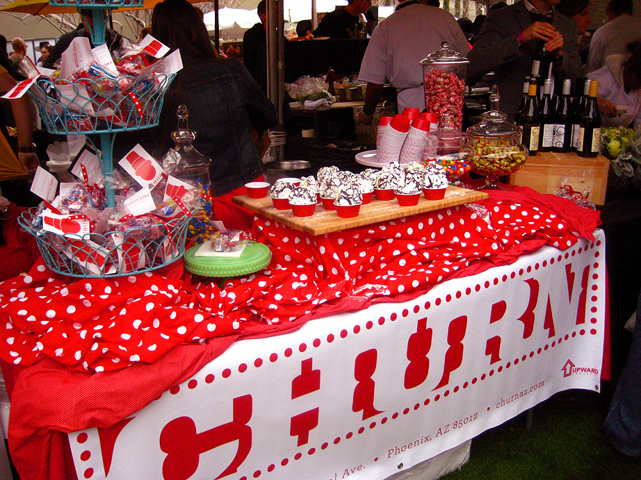 What’s a culinary festival without dessert? There were lots of sweet options at Devoured, but when I saw that Churn was there, I had to try whatever it was that they had. Of my ever-growing list of Phoenix-area food establishments to try, I don’t think any rank higher than those owned by Craig DeMarco, which would include the previously mentioned Federal Pizza, along with Windsor, Churn and Postino. Sadly I didn’t sample anything from Windsor, but I had an amazingly delicious beer-braised short rib from Postino. Ugh, yet another item that I could have eaten for the entire day. When I got to the Churn booth, I snapped up one of their ice cream sandwiches. It was a pretty chilly day today by Phoenix standards, some lingering rain and clouds and temperatures only in the mid 50s, so some might say I’m crazy for having ice cream. However, those who truly know me, know that I would be happy eating ice cream if I was in the middle of a snowstorm, if someone just offered me some. The ice cream sandwich from Churn was perhaps the best non-traditional ice cream sandwich I’ve had. The cookie element was perfectly executed. They were the chewiest, most chocolate-y crinkle cookies in the world, covered with copious amounts of powdered sugar (which promptly got all over my black t-shirt, but I didn’t care much) and surrounding a pleasantly crunchy peppermint ice cream. The contrast in texture was wonderful, with the chewy cookie and occasional crunch from a piece of peppermint candy. It was ultimate way to end my day of basically unrestrained snacking. Last year I was kicking myself for not snagging tickets to Devoured before they were sold out, and I have a feeling I’ll be one of the first in line next year to get tickets. I have only lived in the Phoenix area for less than 2 years, and I haven’t made a significant dent in the list of restaurants I’ve wanted to check out but this year’s Devoured got me that much closer. If anything, I’m more excited now than I was before, to try all these fantastic local places!