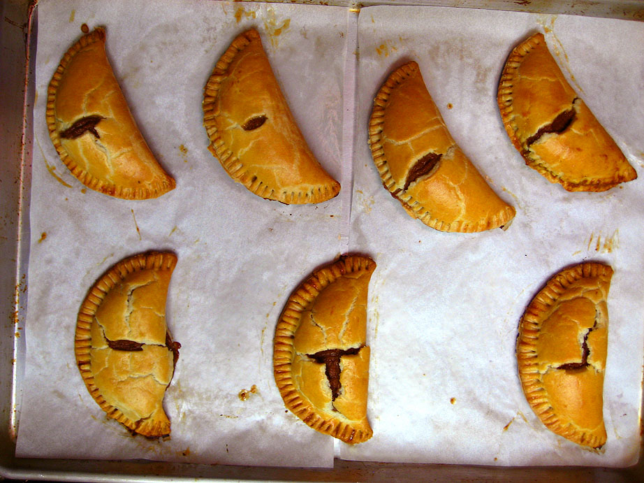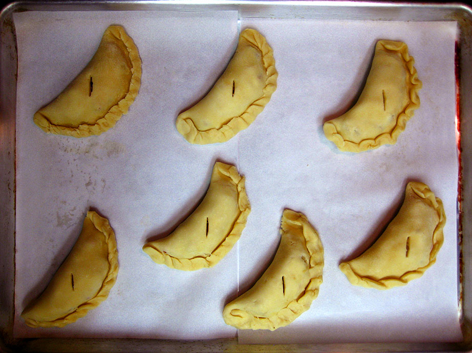 On your rolling surface, take one dough round and spoon about 1-2 tablespoons of filling into the center of the round. Scoop up the round with your hand, forming sort of a taco shape with the dough and filling. Brush one side of the dough edge with some beaten egg and pinch the dough edges together starting in the center and going down each side, making sure to get out any air bubbles that might be in the filling. Lay the sealed empanada on your rolling surface and shape the edge however you’d like. A traditional way is to do a sort of braided edge by pinching the edge starting at one corner and folding it over itself, continuing down the side, slightly overlapping the folds as you go. Continue with the remaining empanadas, placing the filled and sealed empanadas on the prepared sheet pan. Cut a small slit in the top of each one to allow steam to escape while they’re baking. Brush the finished empanadas with beaten egg and bake in your preheated oven for 35 minutes. The empanadas should be golden brown; if they’re not as brown as you’d like, just leave them in for a few more minutes, checking on them occasionally.