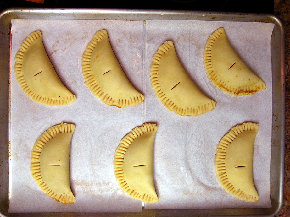 These empanadas can also be frozen before being baked, in the interest of saving time later. Just place the formed empanadas on a sheet pan and place in the freezer until they’re frozen solid, and then put them into a Ziploc bag. Once you’re ready to bake them, put the frozen empanadas onto a parchment-lined sheet pan and brush them with beaten egg. Bake at 375 degrees, adding 5-10 minutes onto the 35 minute bake time, until the crust is golden brown and the temperature of the filling registers 165 degrees on a digital thermometer.