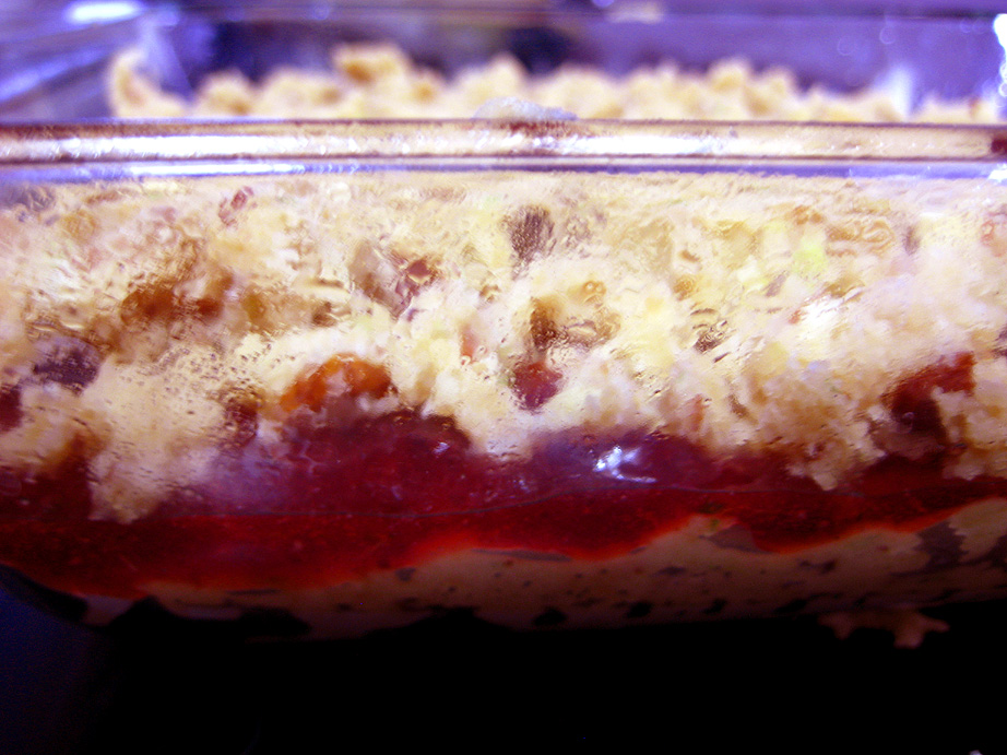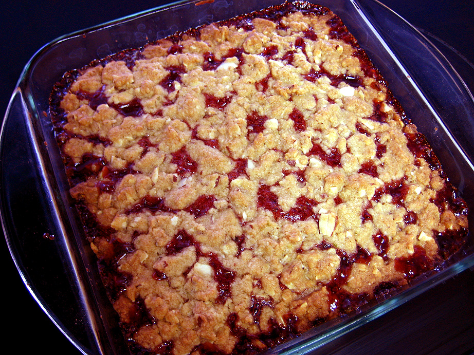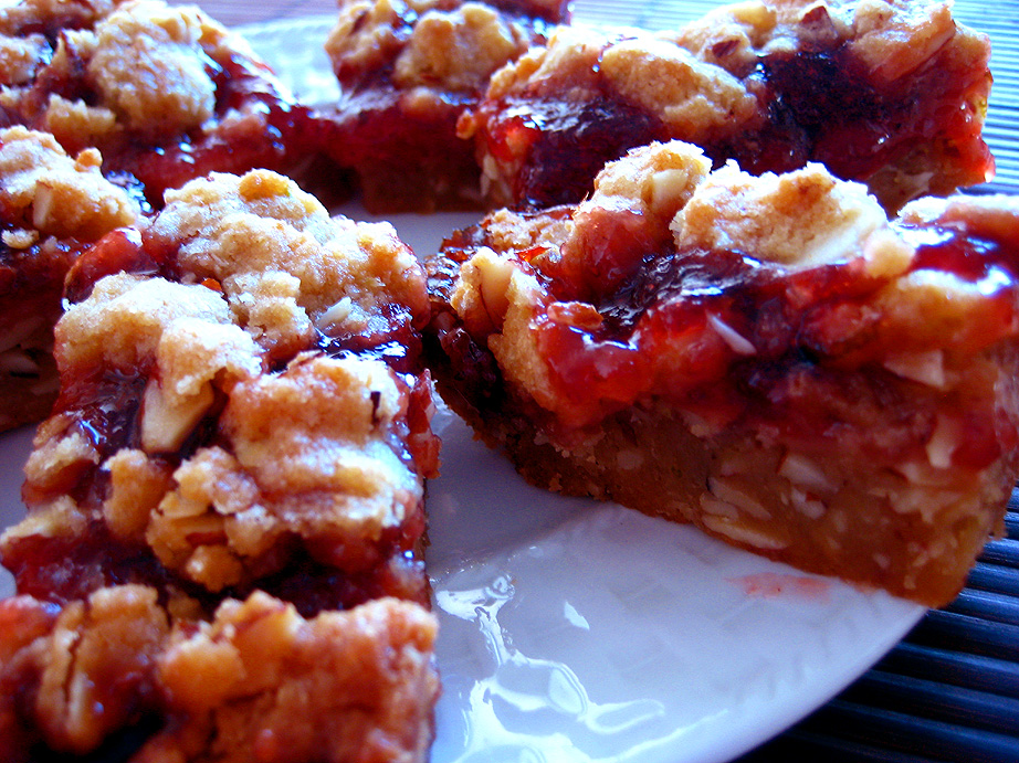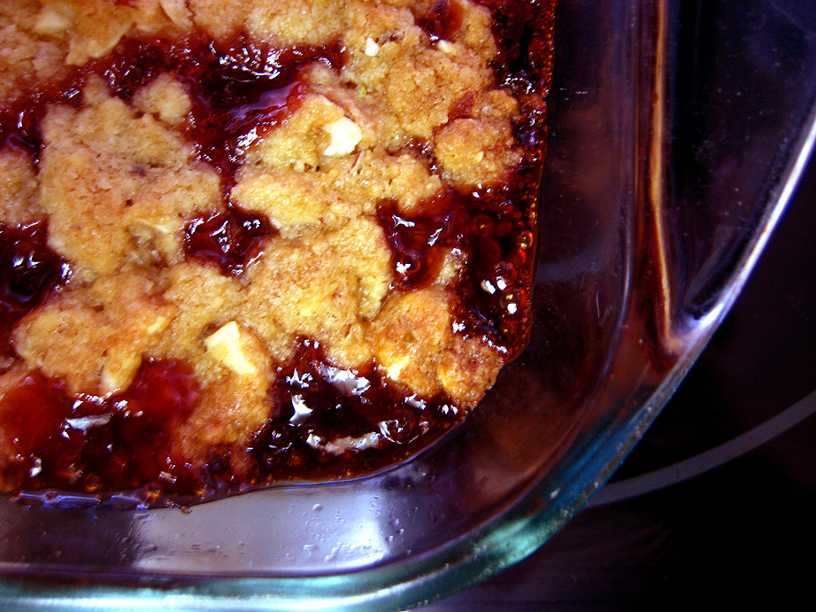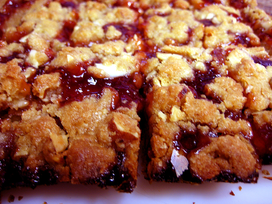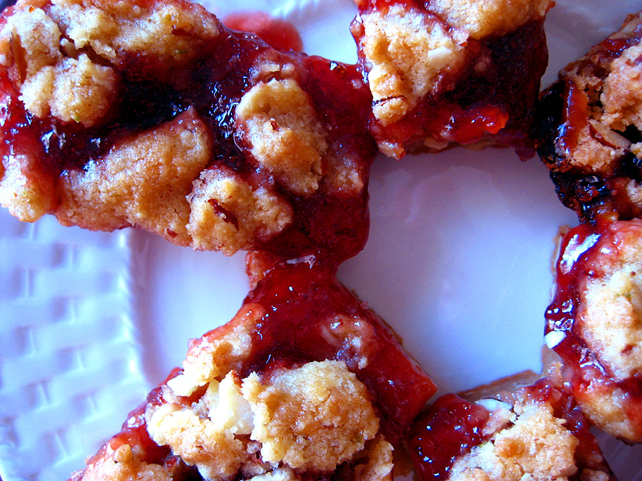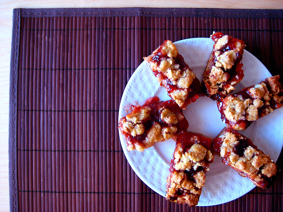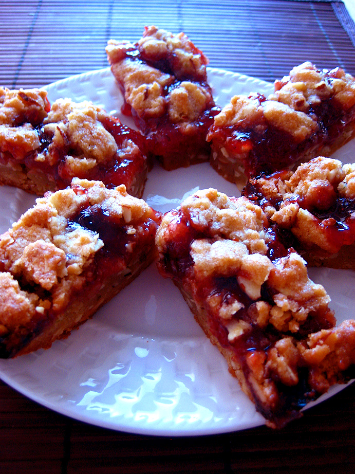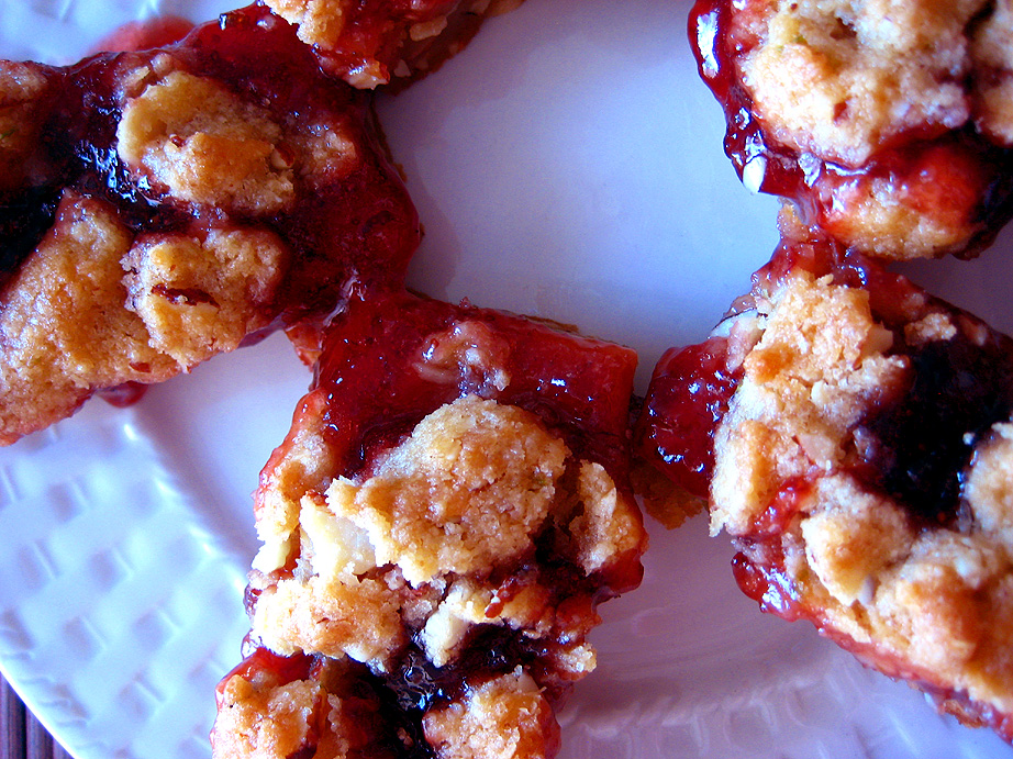 Growing up, my mom had a Land O Lakes cookbook that was given to her as a Christmas gift by one of our neighbors. Of any cookbook my mom had (aside from her ragged and worn 1970s edition of the Betty Crocker Cookbook), we seemed to make things from this book more than most. One such item was a raspberry crumble bar. It was the simplest thing in the world, instructing you to mix up a quick crumbly dough, press half in the pan, spread that half with raspberry jam and crumble the reserved dough on top. Once baked, the bars had a soft and buttery base, topped with tart-sweet jam and tasty little crumbly crunchy bits. My sister and I loved them, and they were basically irresistible cause I never remember any pan of them lasting very long.