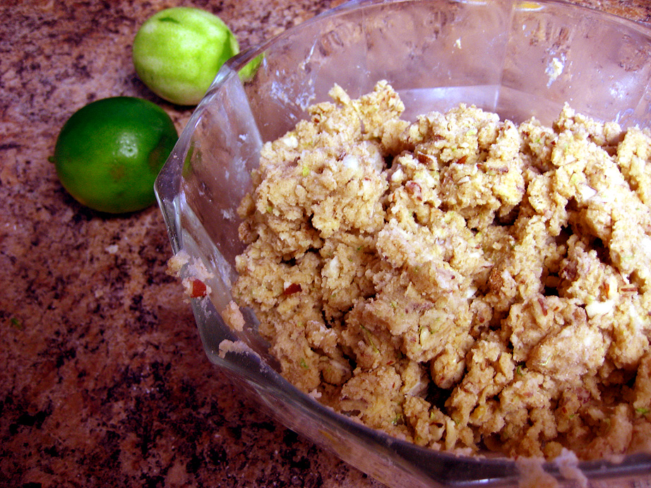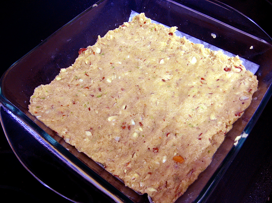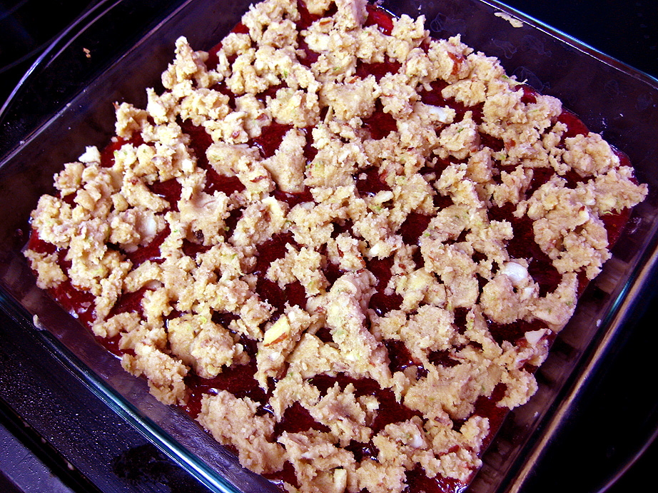 In a medium-large bowl, combine the flour, sugars, almonds and the zest of one lime until they’re well mixed. Add the butter and the egg and mix it all together by hand, sort of squeezing the dough in your hands to make sure it’s fully combined and there’s no flour left at the bottom. Once the crust is all mixed, scoop out about 1 cup of it and set it aside. Take the rest of the crust mixture and pat it out into the bottom of the prepared pan. Set the pan aside, and mix the jam with the remaining lime zest in a small bowl. Spread the jam evenly over the dough pressed into the pan and crumble the reserved one cup of crust evenly over the top of the jam.