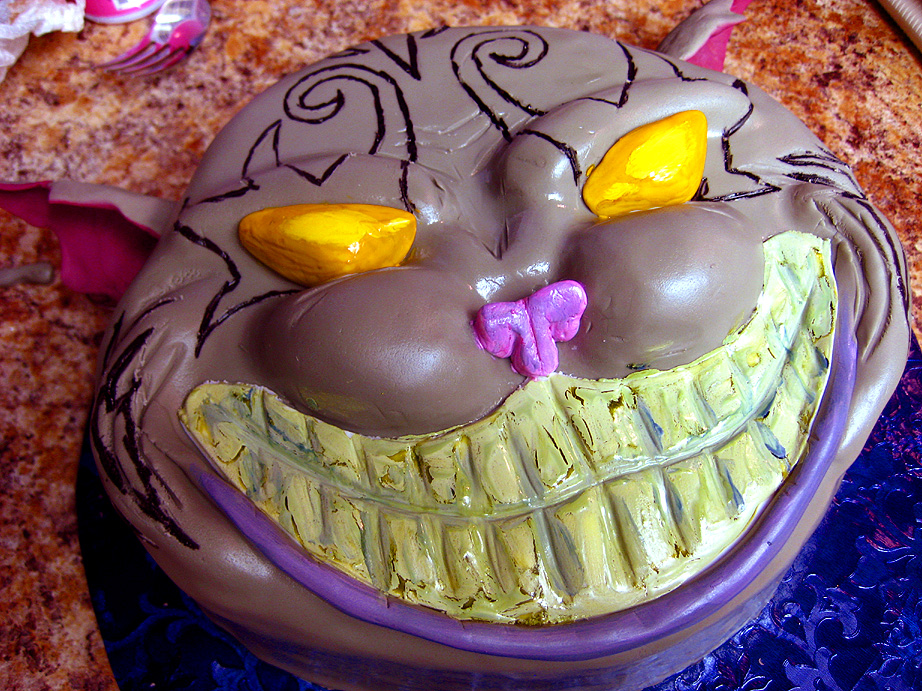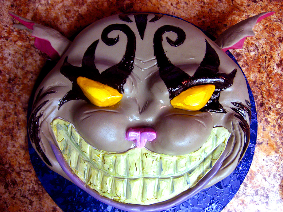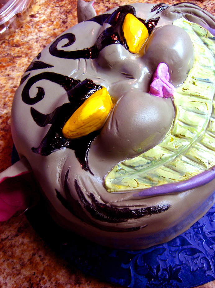 Since I was going to end up with a Cheshire Cat-shaped cake, I carved out the basic shape of the face before I put on the crumb coat of frosting. Here’s the original photo I was working from for the cake’s design: