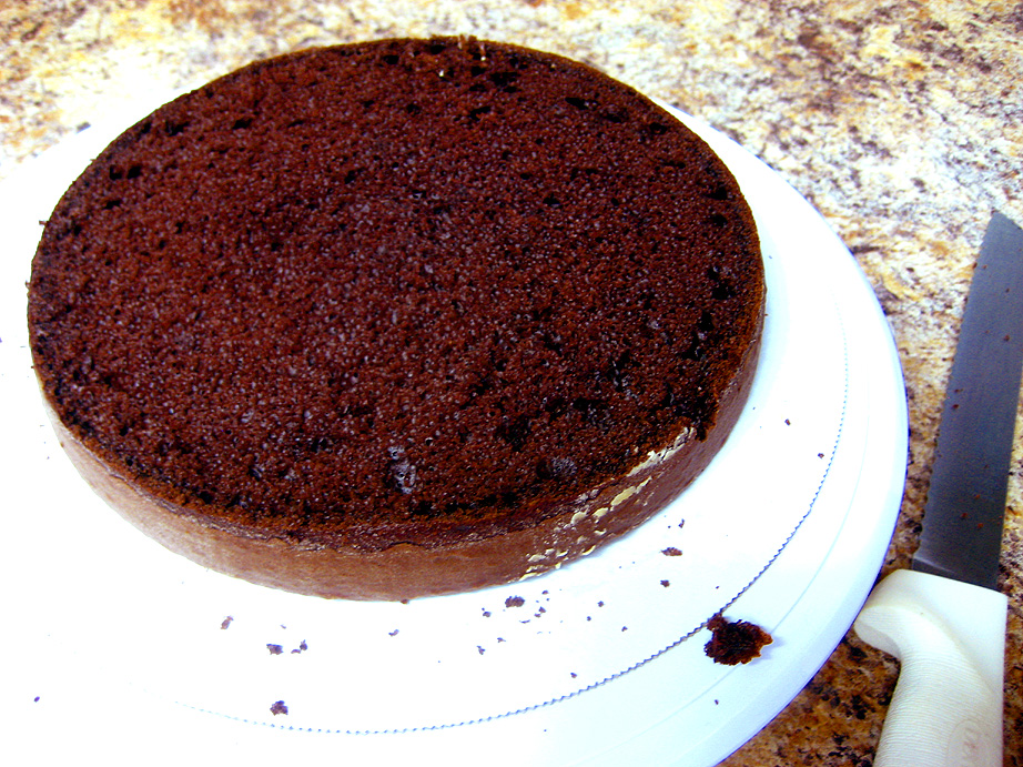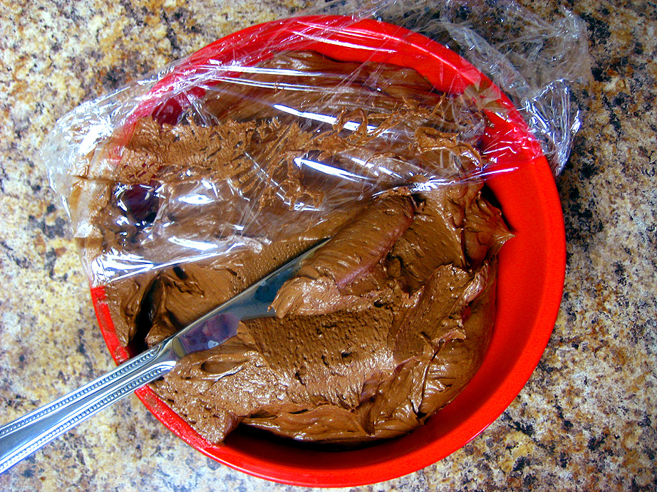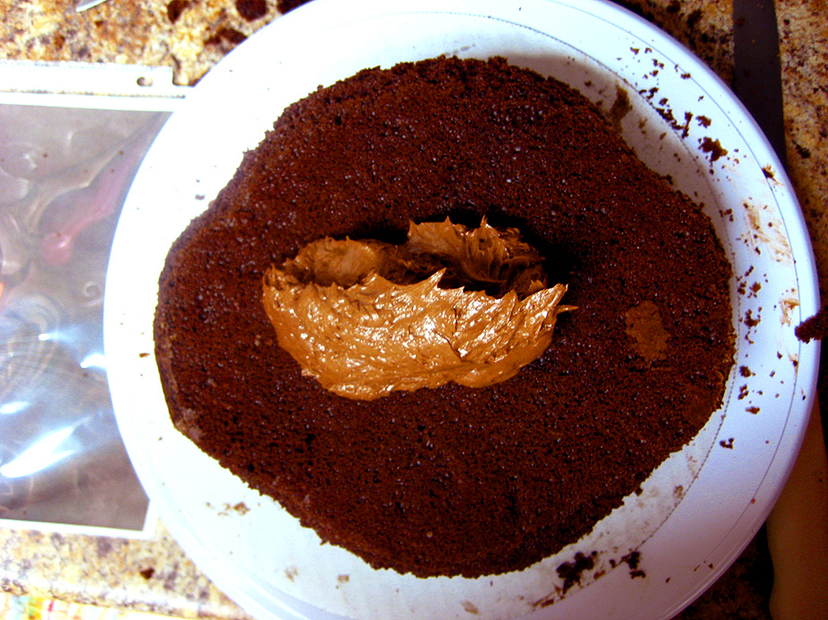 Even though I used boxed cake mix, I can’t abide frosting from a can. I made my own chocolate frosting, a basic American buttercream and it makes a world of difference over canned frosting. After I baked the cake (two 8 inch layers), I let it cool, sliced off the tops to level them and filled the layers with the chocolate frosting.