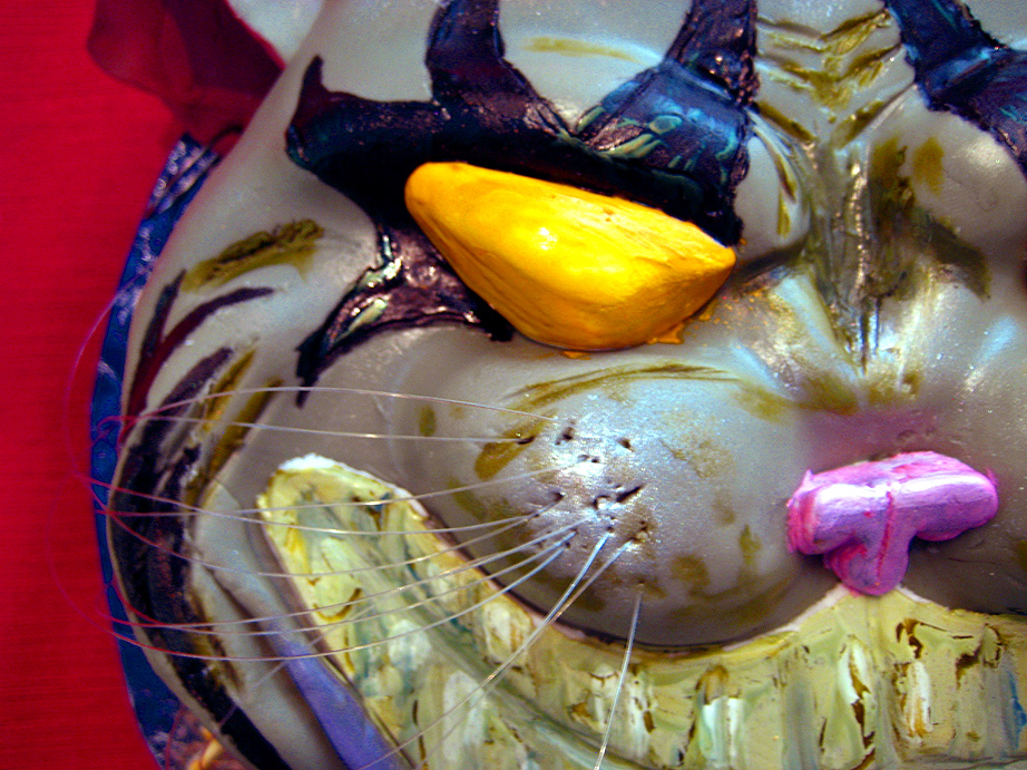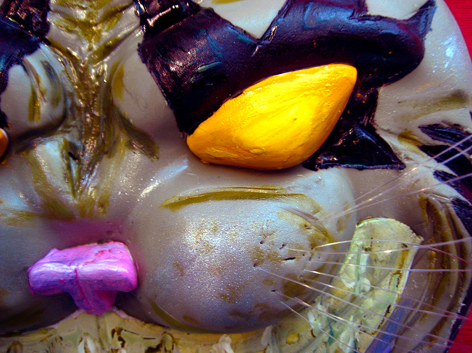 From the get-go, I knew I wanted to use fishing line for the cat’s whiskers. It worked splendidly! I cut small identical lengths of fishing line and shoved them into the cat’s cheeks and voila! Whiskers. I thought they looked pretty realistic.