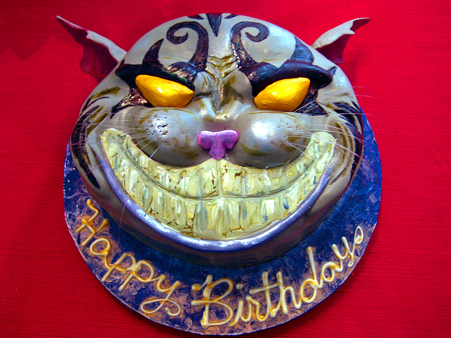 My roommate’s birthday was last weekend. Ben’s always been a fan of Alice in Wonderland and especially took to American McGee’s video game adaptation from 2000. He even has a tattoo of that version of the Cheshire Cat, which is pretty sweet cause it’s mostly in blacklight-reactive ink except for the Cat’s grin. So, unless there’s a blacklight nearby to illuminate the body of the cat, all you see is the black outline of his creepy smile!
