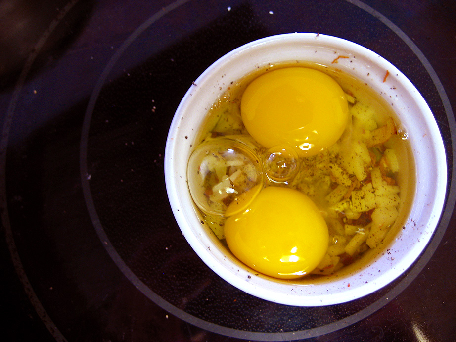 Crack two eggs on top of the leeks/cream/bacon, being careful not to break the yolks. On top of the eggs, put another 2 tablespoons of cream, another tablespoon of cheese, and more salt and pepper.