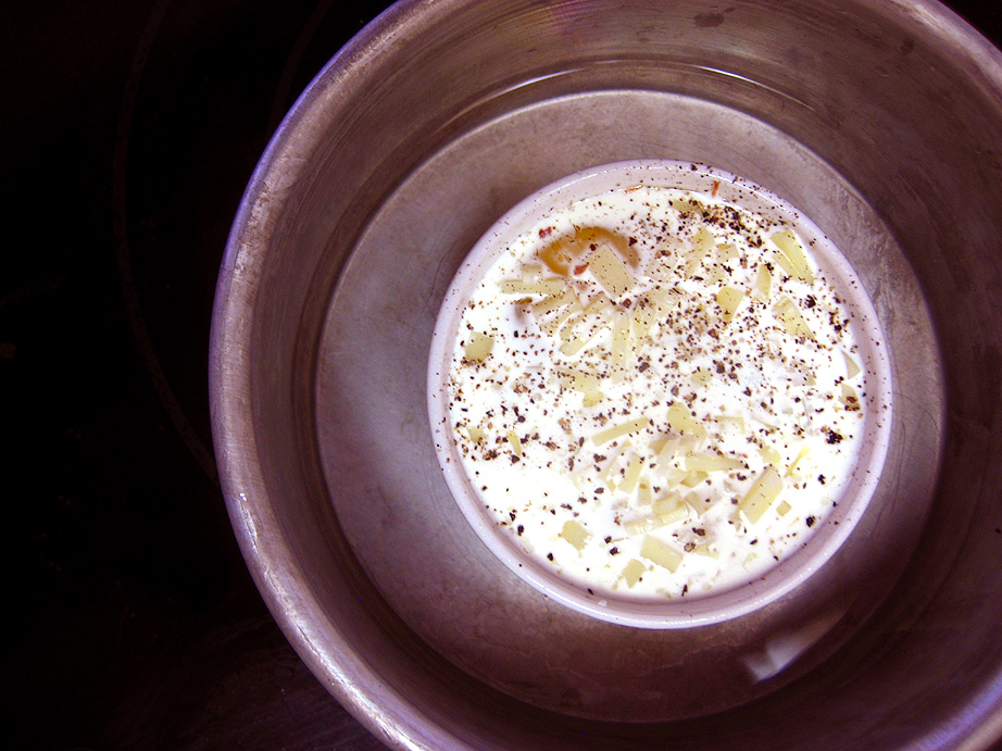 After leaving the restaurant, I was scheming about how I could recreate a similar dish at home. The preparation seemed fairly easy, just throw some eggs and other ingredients into a dish and bake until done. For my version, I used a little ceramic ramekin cause I didn’t have a little cast iron skillet at my disposal, and I also baked the dishes in a water bath to ensure even, slow cooking. No overcooked eggs allowed!