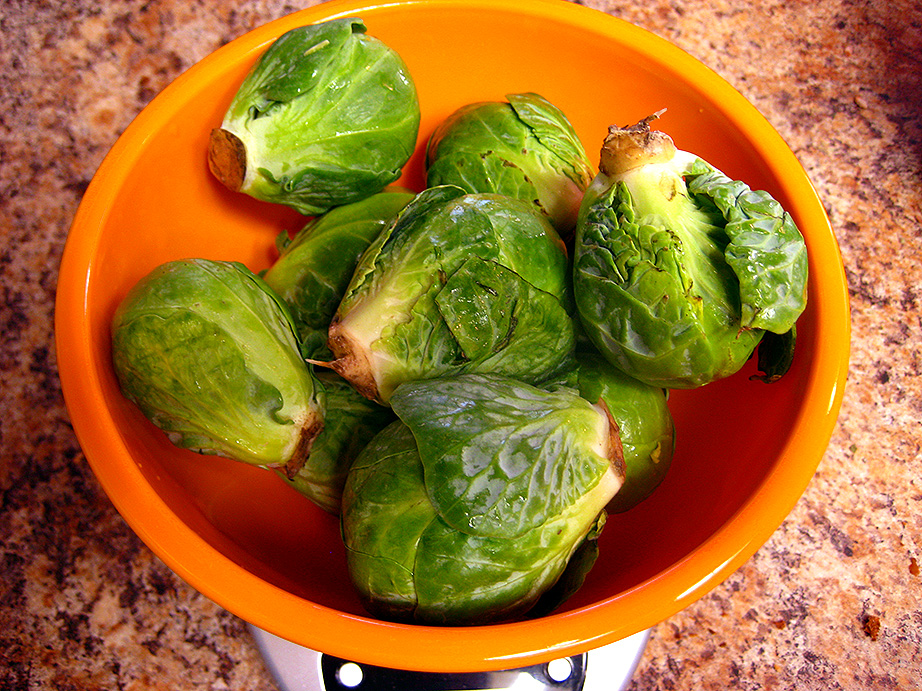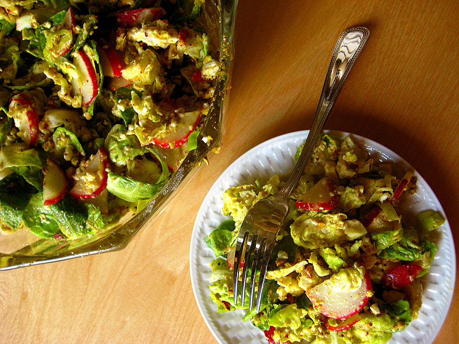 Wash the radishes and cut off the root and stem ends. Cut them in half, and cut each half into thin slices. Throw on top of the brussels sprouts.