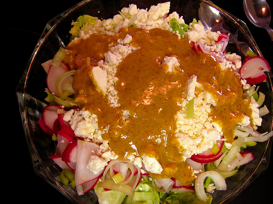 This salad is super tasty and has crunchy, creamy, salty, bitter and sweet elements all rolled into one. It’ll go great with roast chicken and scalloped potatoes (how I served it), or simply on it’s own with a big glass of iced tea and some warm buttered french bread. Eat it outside this spring, and wave goodbye to the chill of winter!
