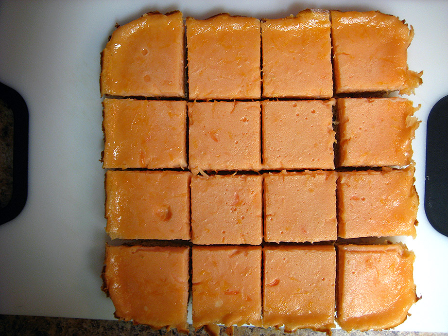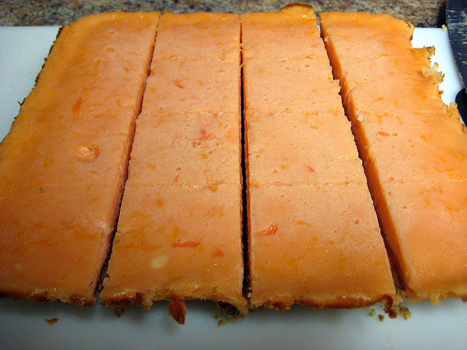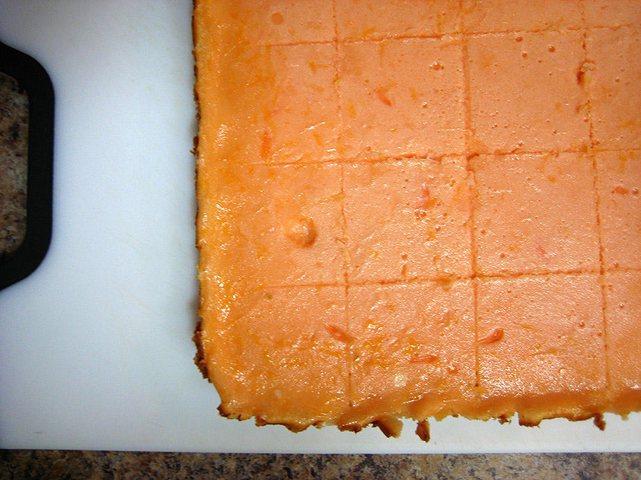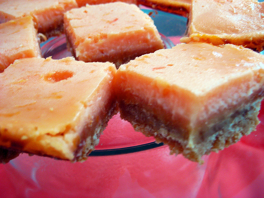 Score the bars with a large knife, into a total of 16 2-inch squares. Keep a pitcher of hot water and a paper towel handy when cutting through the bars, to clean the knife and wipe it dry between cuts. That grapefruit filling is super sticky and it’ll make a big mess of your pretty bars if you have to drag a dirty knife through them!