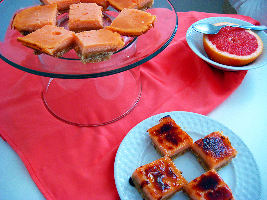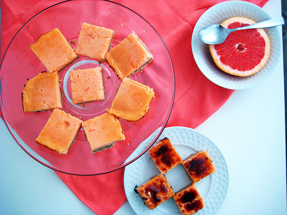 Remember in the move Amélie, how one of her favorite things was cracking the sugary top of crème brûlée with a spoon? It is rather fun, except here with these bars, you get to crack the sugary top with your teeth, and it’s much more fun than any spoon. The shortbread crust has a light caramel flavor on it’s own, thanks to the brown sugar, and the softness of the sweet-tart-bitter grapefruit filling is offset by the crackly-crisp thin sugar topping. I think my grandma would approve.
