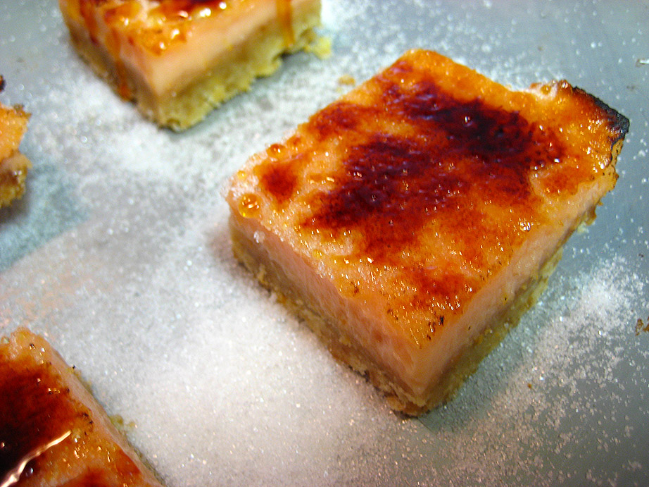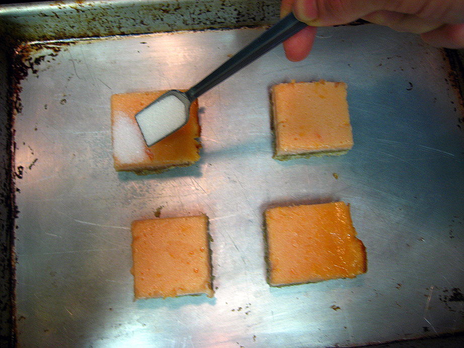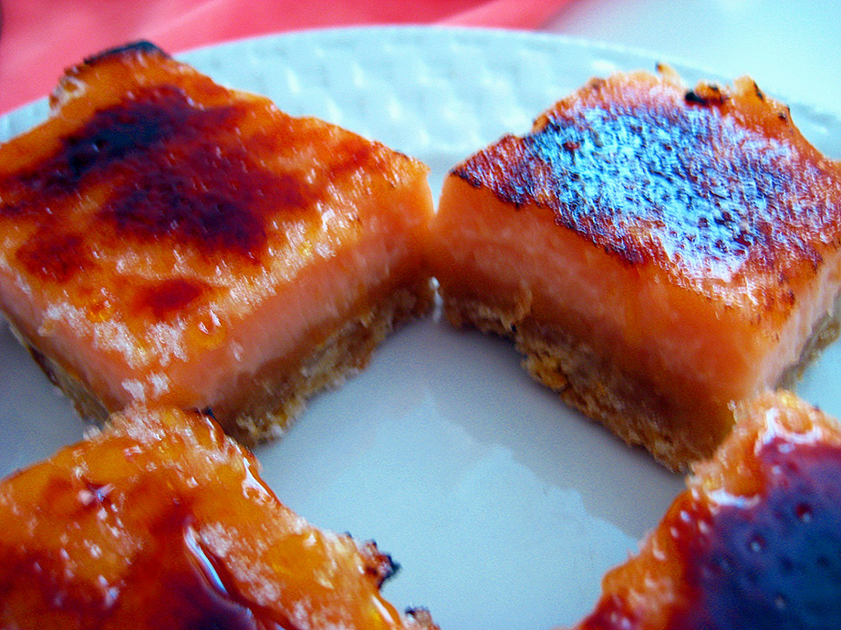 Now, the fun part. While these bars are plenty tasty on their own, that’s not what we’re here for. When you’re ready to serve the bars, grab a heat-proof surface like a sheet pan, and place the grapefruit bars onto it with a little room in between each one. Evenly sprinkle each little bar with a 1/4 teaspoon of granulated sugar, and bust out your kitchen torch! Sadly, I’m lacking in the awesome kitchen torch department and all I have is a tiny little butane-powered plastic thing that came with set of ramekins specifically for making crème brûlée. Even though it’s kinda puny and silly, it works just fine. Fire up your torch and, moving in a relatively fast circular motion about 2 or so inches from the surface of the sugar, caramelize the tops of each bar. Be warned, the sugar will continue to darken once you move the flame away, so move the torch once the sugar gets a light golden brown. Mine are a little too dark for my liking, but live and learn. What you’re aiming for is a thin layer of slightly burned sugar that will harden up like candy once it cools.