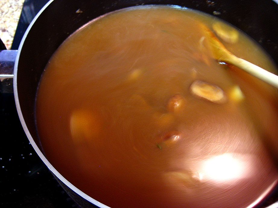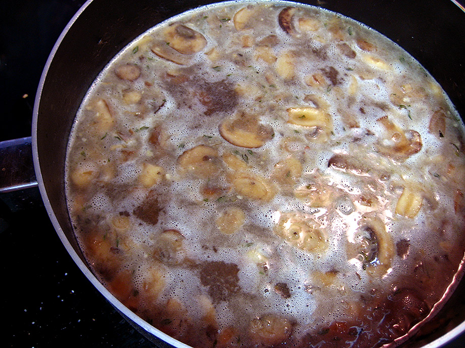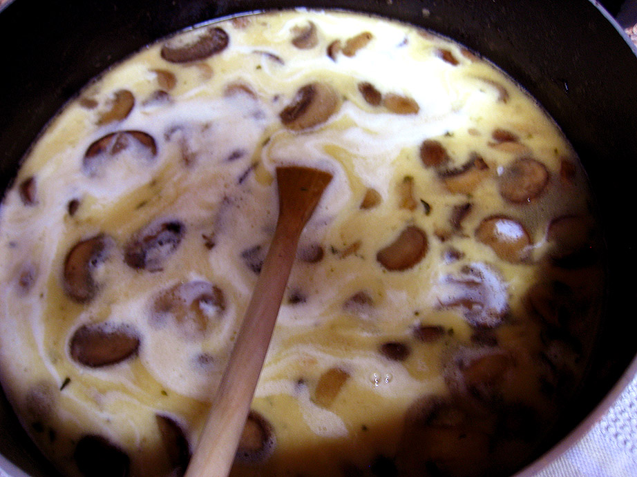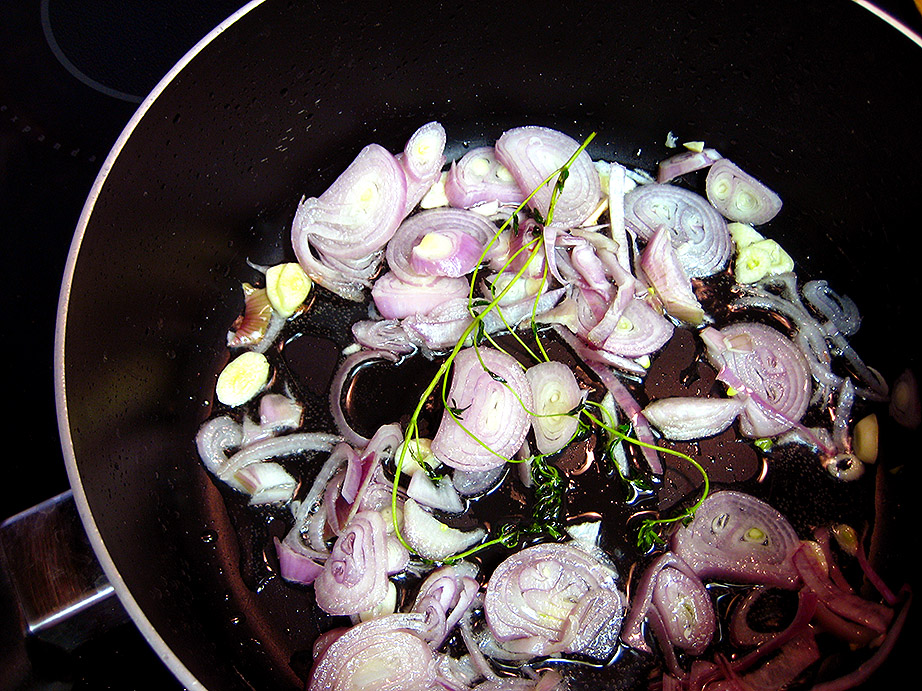 Add the broth and the water and cook for half an hour on medium-high heat. Once the time is up, fish out the thyme sprigs and add the cream and the butter to the pot.