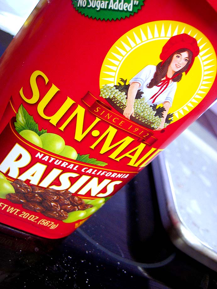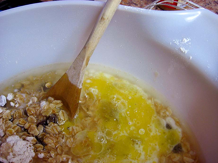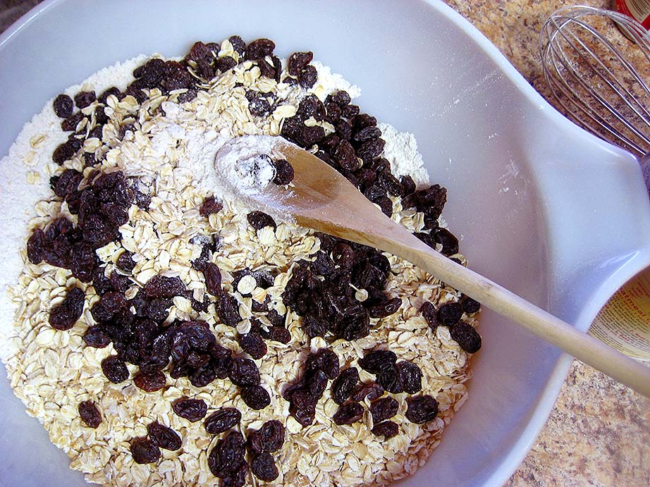 Preheat the oven to 400 degrees and line a sheet pan with parchment paper, and set it aside. In a large bowl, whisk together the flour, sugar, baking powder, baking soda, cinnamon and salt. Dump in the raisins and the oats and stir them around until they’re well mixed.