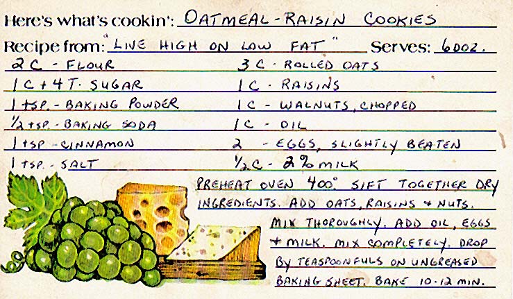 This is the recipe for the cookies, in my mom’s perfect block print handwriting. The recipe is originally from a cookbook called Live High on Low Fat, which was originally published in 1962.