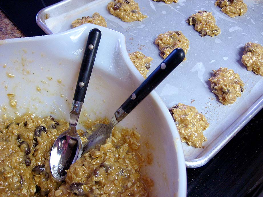 Using two spoons, scoop out a heaping spoonful of dough and use the second spoon to push the dough onto the sheet pan. I was able to fit 15 blobs of dough on one sheet pan without the cookies running into one another too badly during baking.