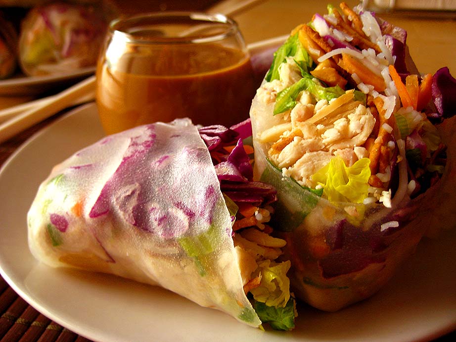 Gently remove the wrappers from the water and lay them on top of each other on a large plate or your clean counter top. Smooth the wrappers so they don’t have any wrinkles, and place some purple cabbage shreds down first, followed by some shredded carrot, minced green onions, mint leaves, soft rice noodles, crunchy rice noodles (if using), chopped peanuts, lettuce, and your chopped chicken (or tofu, if you’re going the non-meat route).