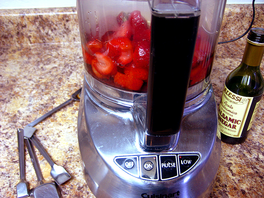 In the bowl of a food processor (or you can use a regular blender, or an immersion blender in a large bowl), pour the thawed strawberries and the simple syrup, black pepper and balsamic vinegar. Feel free to add only 1 tsp of black pepper if you want the spice toned down a bit. Puree the mixture completely, scraping down any errant pieces of strawberry that don’t want to get blended up.
