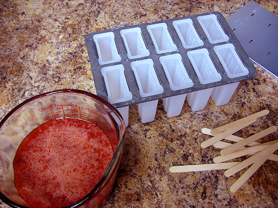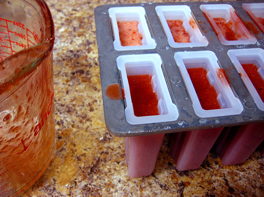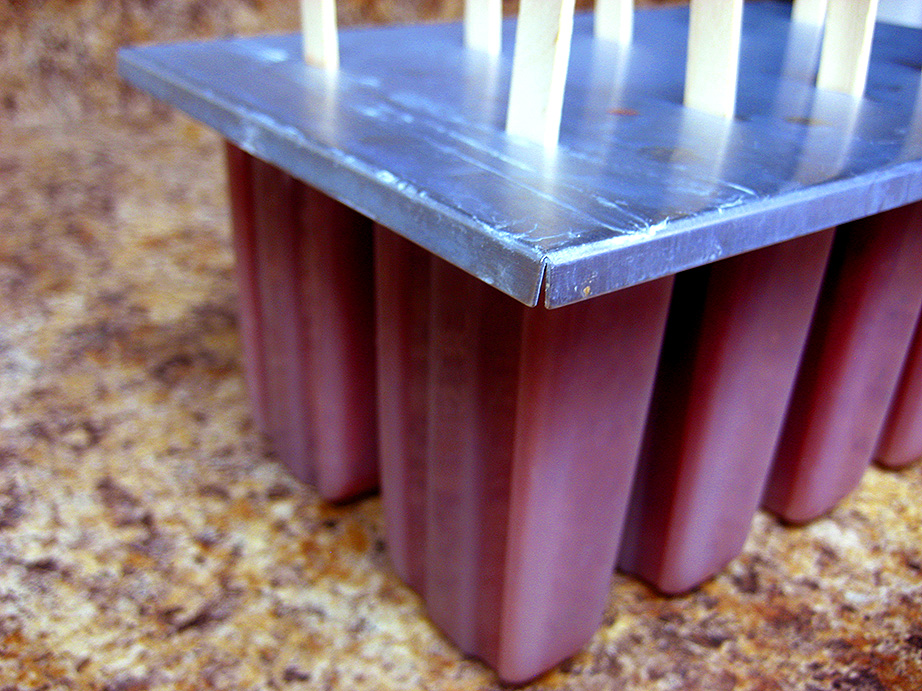 Pour your popsicle fixins into a large measuring cup and carefully fill your popsicle mold, leaving about a quarter inch of space at the top so the pops don’t expand and freeze to the lid of the mold (if it has one). Place the top on, and insert popsicle sticks. I find that a big bag of these sticks from Michaels works just great, and they’re inexpensive to boot. It says that they’re non-food safe but honestly, I’ve never had a problem with them. You probably wouldn’t want to gnaw on the stick once you’re done with the popsicle though, just to be safe.