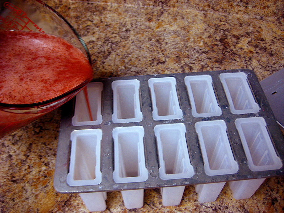 Grab a popsicle mold and let’s get to filling! I have this particular style mold, and I love it. It has 10 cavities for standard 3 oz popsicles. This popsicle mixture will yield about 3 cups of liquid, so plan accordingly with your popsicle molds.