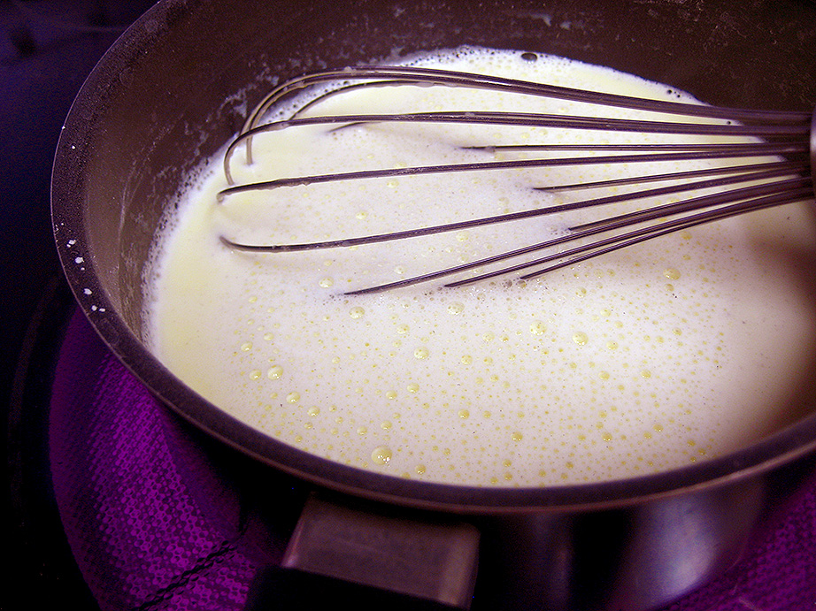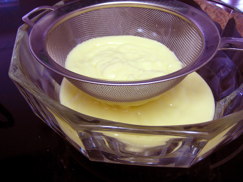 Now it’s time to make some basic vanilla pudding base! In a medium saucepan, whisk the 1/3 cup of sugar with the cornstarch and salt. Add the egg yolks and sour cream, and whisk it all until it’s perfectly smooth, being sure to get all the sugar mixture that’s at the bottom edges of the pan. Add the milk and whisk it all until it’s combined and lump-free. Turn on the heat to medium-low and cook, stirring occasionally, until the mixture comes to a boil. Lower the heat slightly and cook for one minute while whisking. Strain the pudding into a clean medium-sized bowl and stir in the vanilla extract. Set the bowl aside.