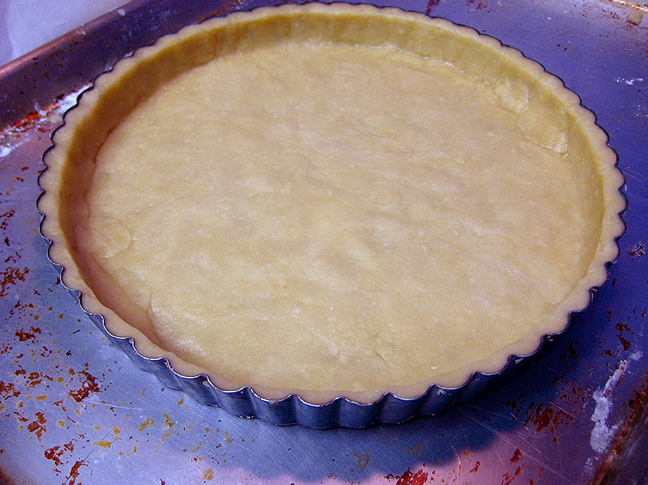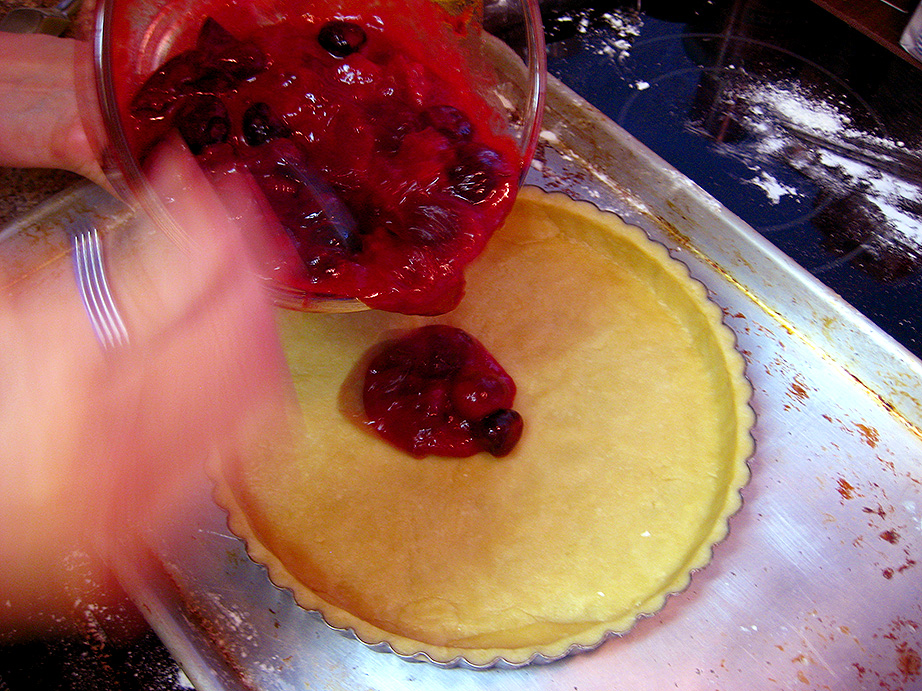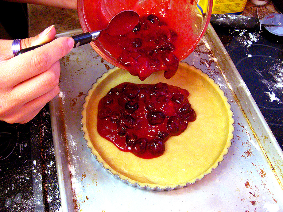 Dump this soft dough onto a well floured surface, patting it out and flouring the surface of the dough as well. Roll it out with a rolling pin to a circle about 12 inches across. Carefully lift the dough circle and place it gently into the waiting tart pan, pressing it together if any cracks form. Press the dough well into the bottom edge of the pan and using your thumb, roll the excess dough off over the top edge of the pan. Press the dough into the sides of the pan and flatten the dough level with the top of the pan so that there’s a uniform, flat crust edge along the top of the tart pan. Gather up the remaining scraps of dough into a ball, and roll it out into a rectangle. Using a pizza cutter or a sharp knife, slice the rectangle into 12 long strips for the lattice crust and set them aside.