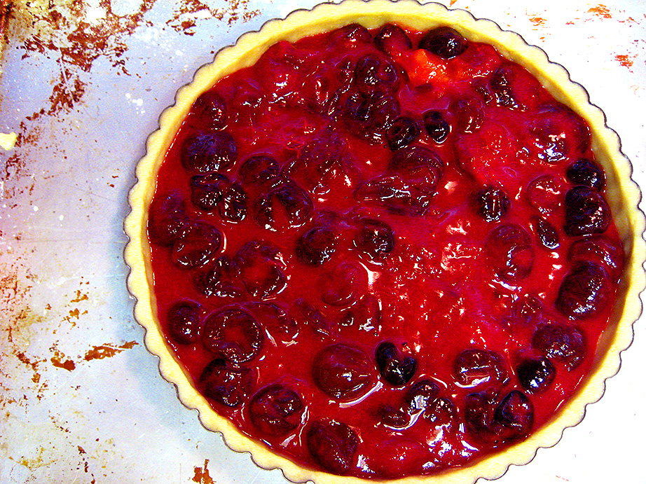 For the tart filling, place the halved apricots in a bowl along with the drained cherries. Sprinkle on the sugar, cinnamon and cornstarch and stir well. Stir in the vanilla and almond extracts and pour the filling into the prepared crust.
