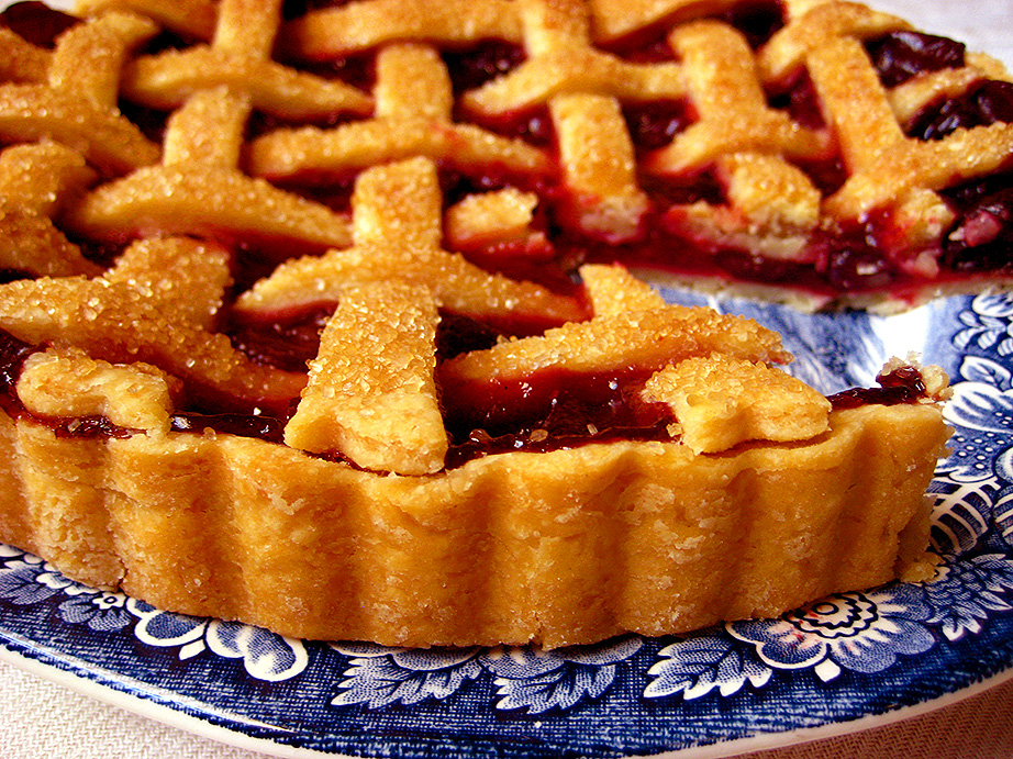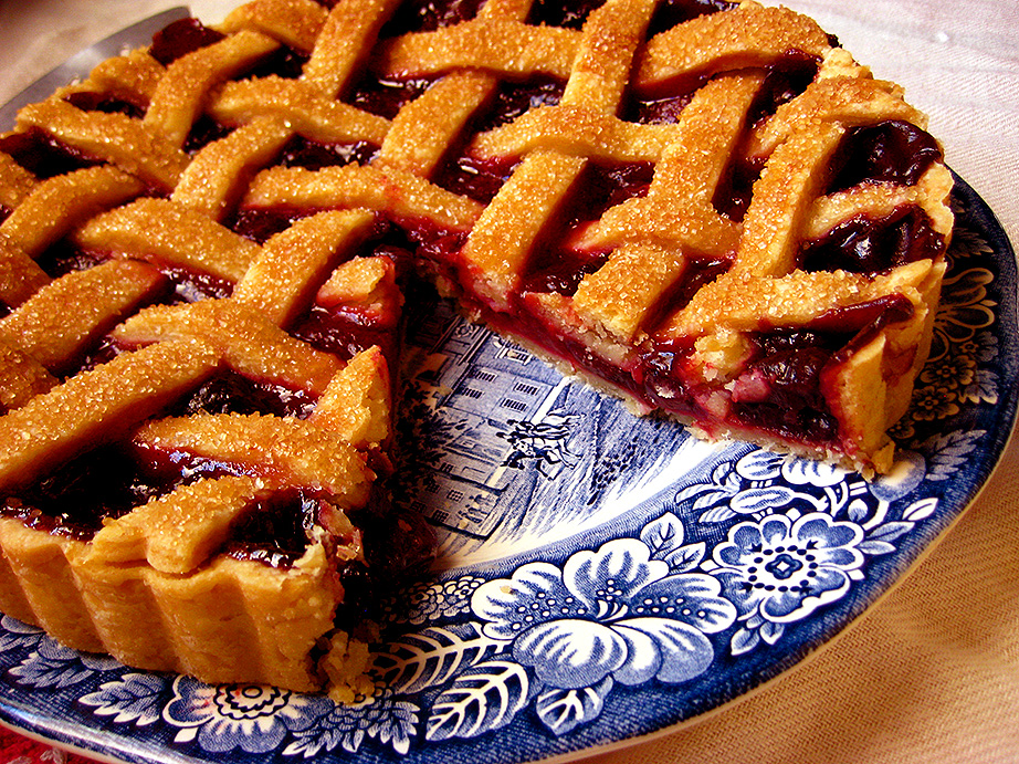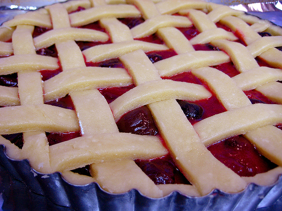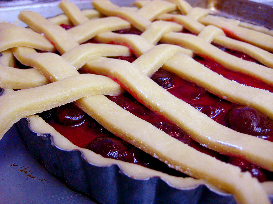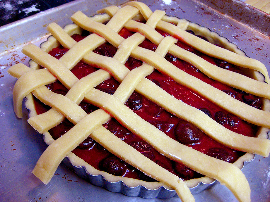 To form the lattice crust, lay 6 strips of dough evenly across the top of the tart. Starting from the top, pull back every other strip of dough and lay one of the remaining dough strips down perpendicular over the strips that are still on the filling. Next, start from the bottom and pull back the other three alternating strips of dough and place another remaining dough strip down. Continue in this way, alternately lifting three strips of dough and arranging another dough strip down until they’re all evenly spaced across the surface. Once all the dough strips are down, remove the excess dough from each strip by pressing down on them at the edge of the tart pan.