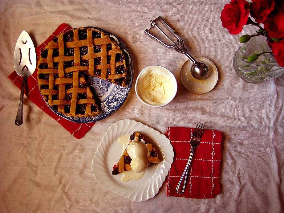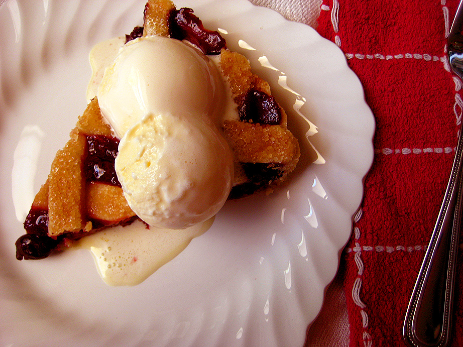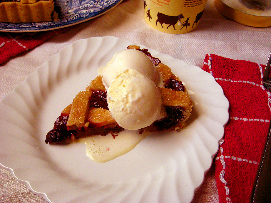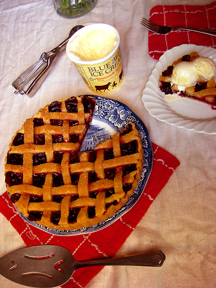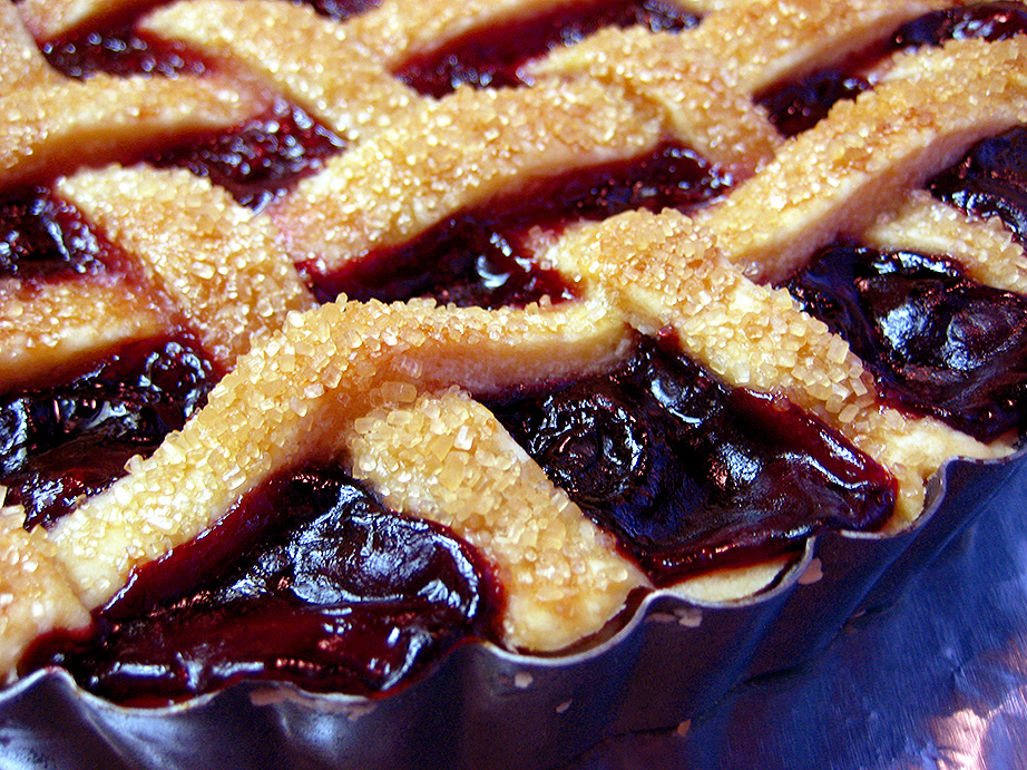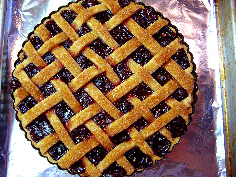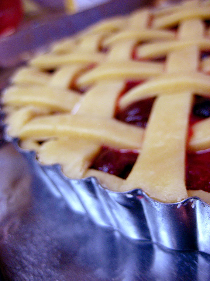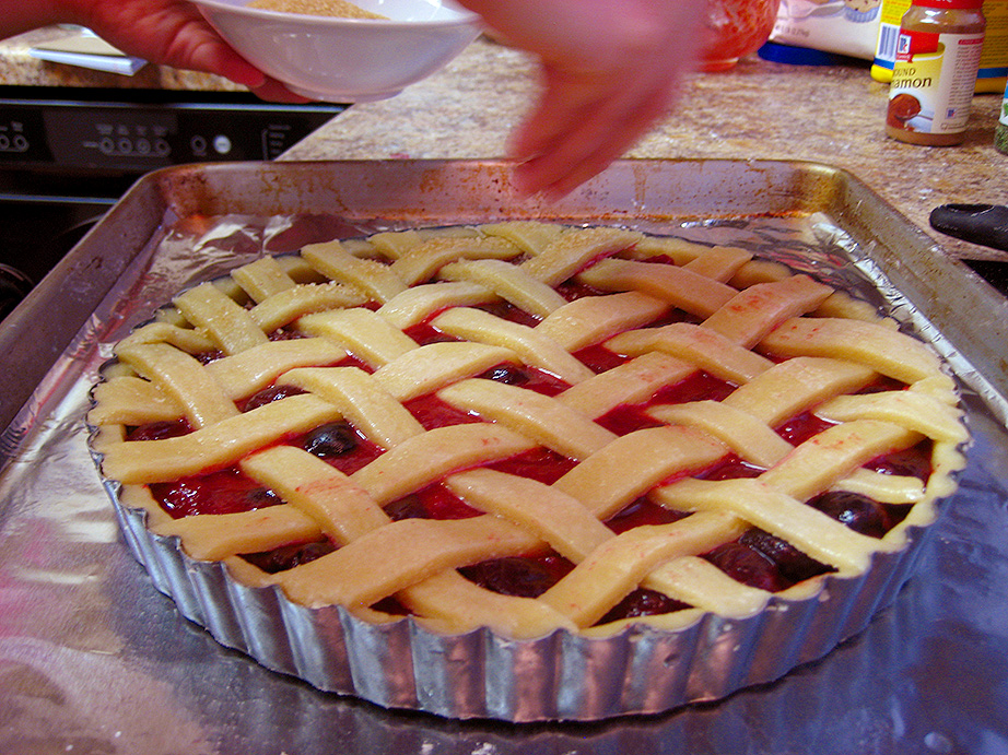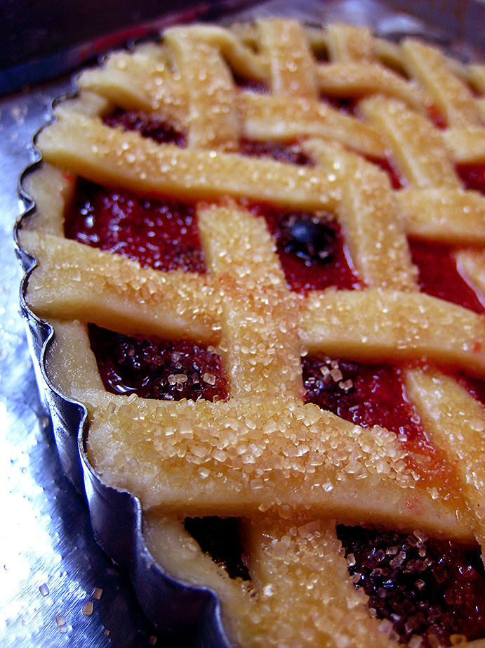 With a pastry brush, dampen the strips of dough on the top and sprinkle on a hefty amount of raw/turbinado sugar. Bake the tart on a foil-lined baking sheet for 70 minutes at 350 degrees. When it’s done, the filling should be bubbling and thickened, and the crust will be pale golden brown.