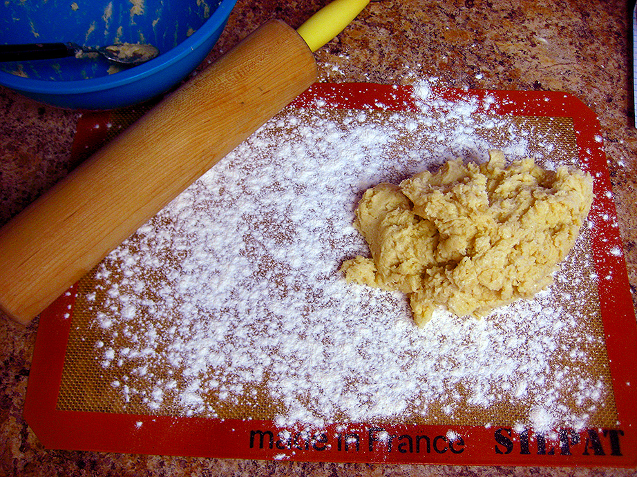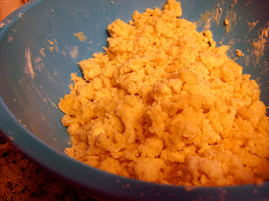 It’s tart crust time! Start by mixing your 2 cups of flour, salt, and sugar in a medium sized bowl. Add the Earth Balance (or butter, if you’d rather go the traditional route) and work it into the flour mixture with your fingers until it’s damp looking and crumbly — it’s okay if there’s a few chunks of fat left at this point. In a small bowl, stir together the 1/4 cup of flour and 1/4 cup of water until it’s smooth, and stir this into the crumbly flour mixture with a wooden spoon until a soft, slightly sticky dough has formed.