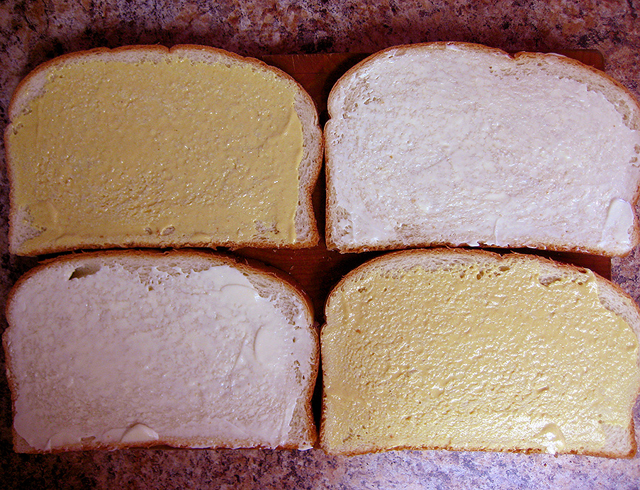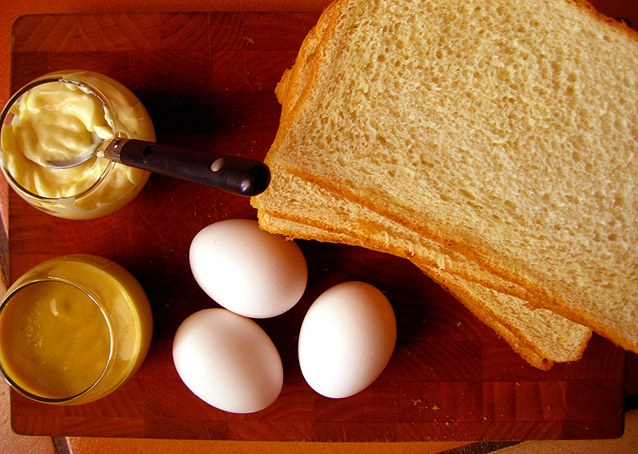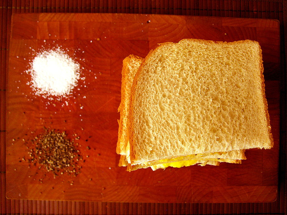 Spread two slices of bread with 1 Tablespoon of mayo each, and the other two slices with 1 Tablespoon each of mustard. Once your egg is cooked, put it on one of the slices of bread, and cook your next egg. When that egg is done how you like it, put it on bread slice number two. Top each half of each sandwich with a sprinkling of salt and fresh ground black pepper, top the egg with it’s other piece of bread, and cut each sandwich in half. Now, you know what to do — scarf ’em down! Feel free to share the second sandwich with a friend, if you’re feeling generous (or just not that hungry).