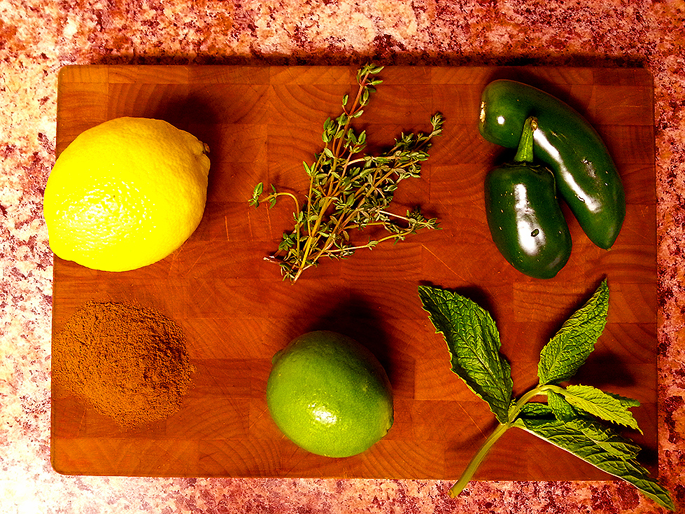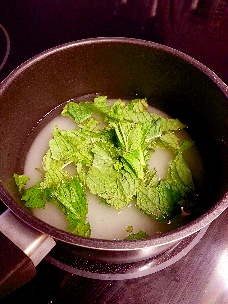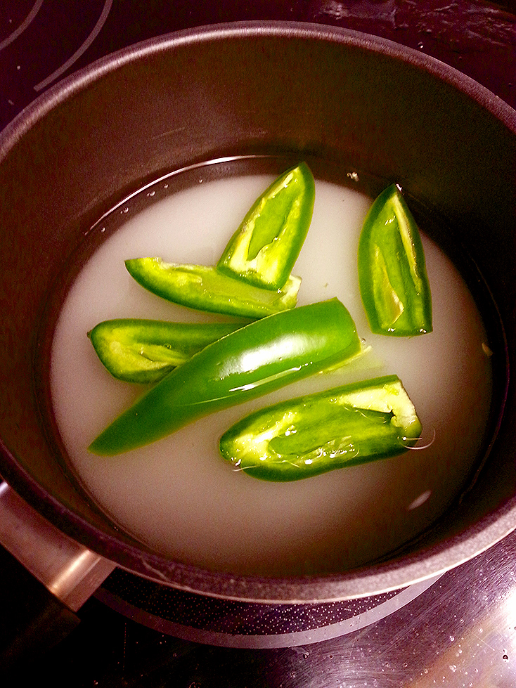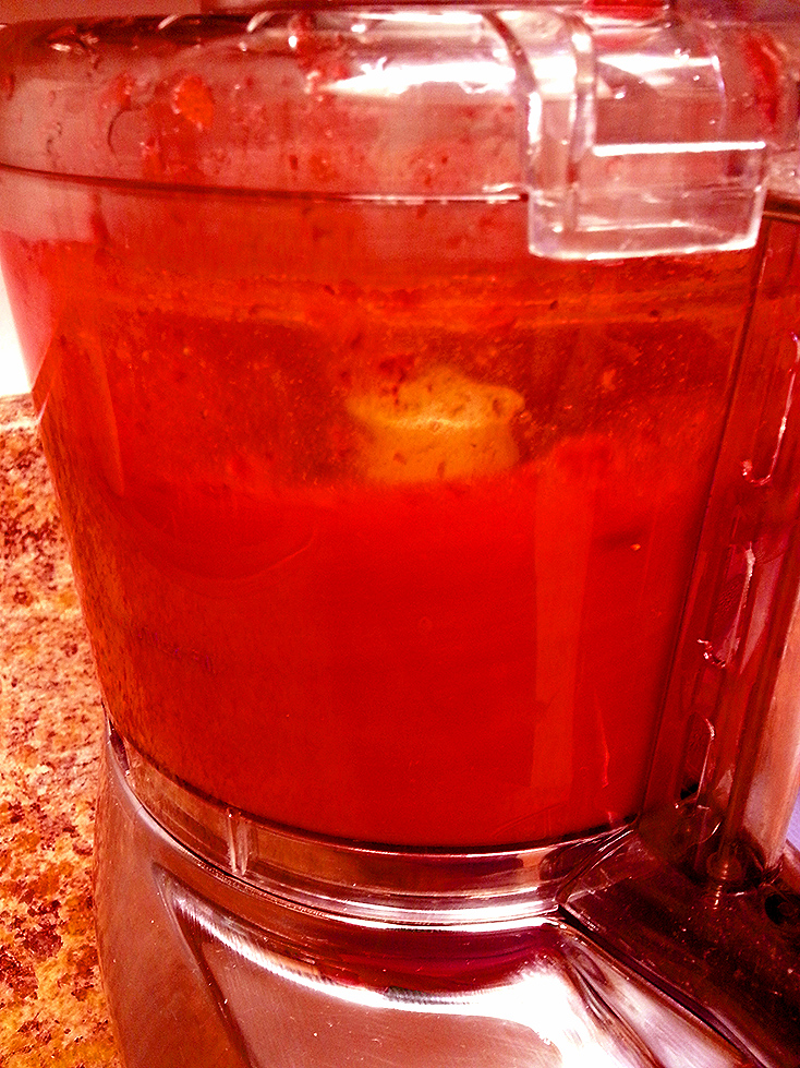 For each flavor of soda, the method is the same. Begin by making the simple syrup! In a saucepan, combine the sugar and water, along with the jalapeños/cinnamon/mint leaves/thyme sprigs. Cook the syrup with it’s flavoring ingredient on medium-low heat for 10 minutes. Stir occasionally to slightly break down the flavoring components. While the syrup is cooking, throw your frozen fruit into a large food processor or blender along with your extras like lime or lemon juice, or vanilla extract, depending on the flavor you’re making.