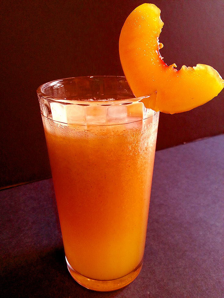 16 oz frozen peaches / 1 tsp cinnamon / 1/2 tsp vanilla extract / 1 tsp lemon juice / club soda, chilled
