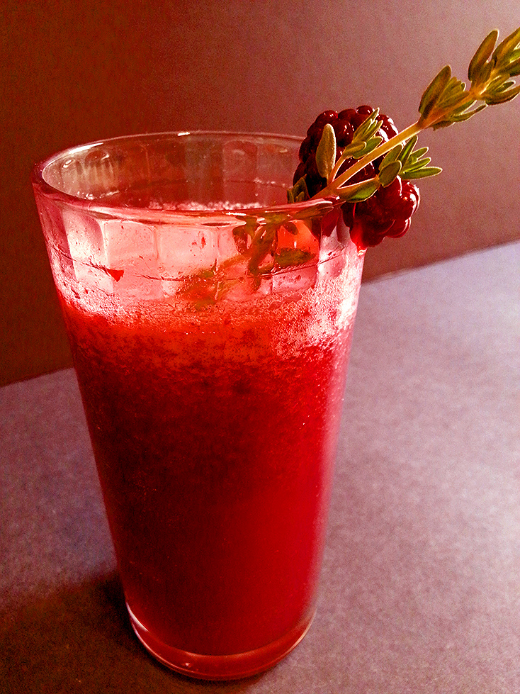 16 oz frozen blackberries / small handful fresh thyme sprigs / 2 tsp lime juice / club soda, chilled