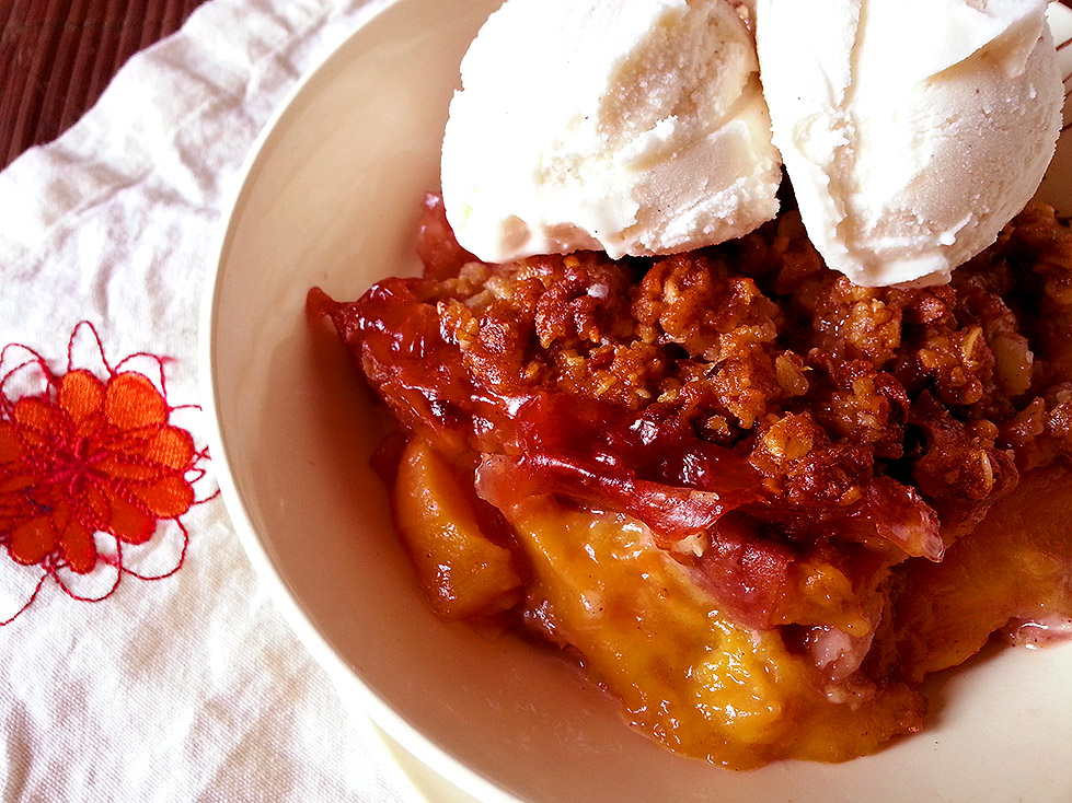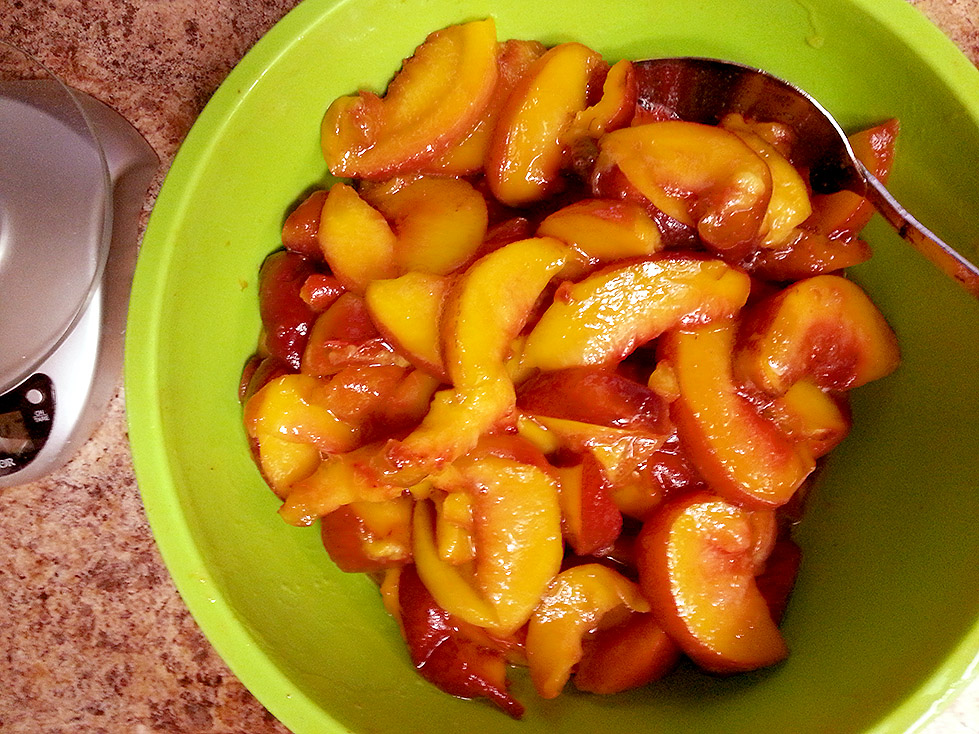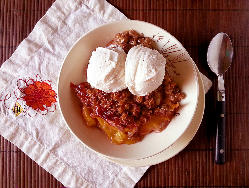 Bringing home several pounds of fresh peaches is a little daunting, but it’s a fun challenge to decide what to do with them. I have a few ideas in my head for the peaches I still have, but the first thought that came to mind was to turn these awesome peaches into a peach crisp. Maybe with a little complementary almonds and honey? I think that’ll do just fine.