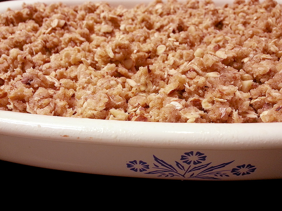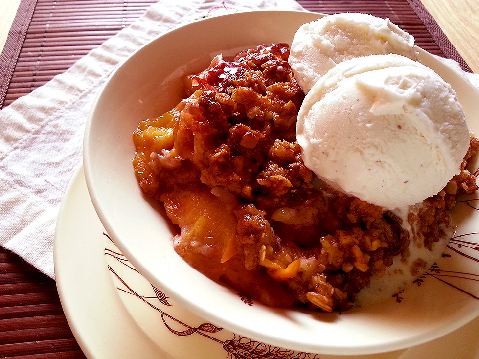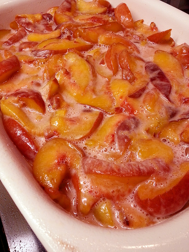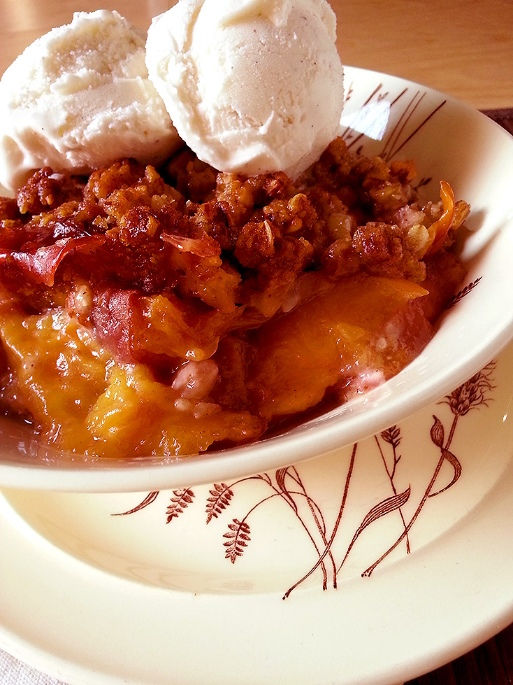 Sprinkle the prepped peaches with the crumble topping, making an even layer with no peaches exposed. When the peaches are all covered, place the baking dish on a rack in the center of your oven and bake for 50 minutes, After 50 minutes, the fruit should be bubbling all over, and some of the peach juice should have bubbled up over some of the topping. The topping will be golden brown. Notice how good your house smells now?
