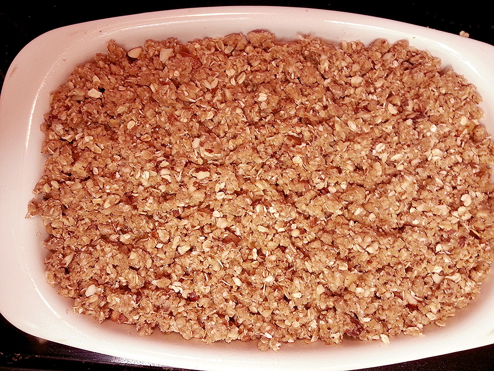 In a medium sized bowl, stir together your oats, flour, brown and white sugars, salt, cinnamon, vanilla and almond extracts, and your chopped almonds. On top of that, pile your cold butter chunks and honey. Using your hands, work the butter chunks and honey into the crumble mixture as if you were making a biscuit dough or pie dough. Try to break down the cold butter so there are no large chunks remaining. When the crumble topping is ready, it should be uniformly damp and clump together when squeezed in your hand.