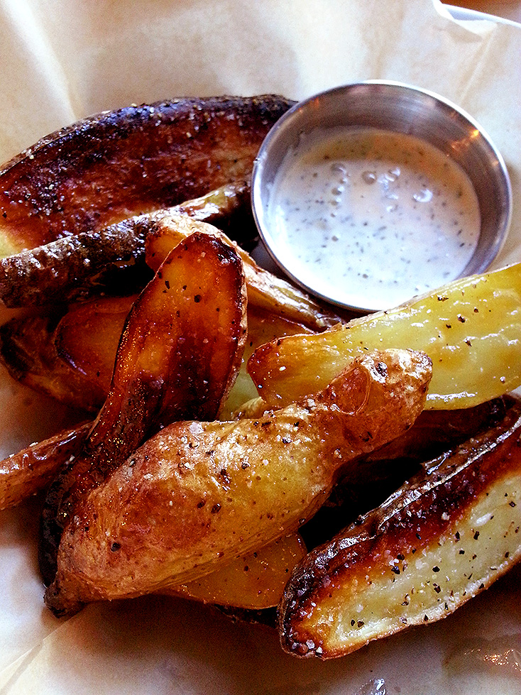 We decided to share an appetizer order of their Spud Fingers ($4.95, but $1 off during happy hour), halved fingerling potatoes that were roasted and served with a side of their house-made ranch dressing. The potatoes were well seasoned with a good hit of salt, and they were great with the garlicky ranch. My only gripe with the potatoes is that the texture of some of the them was a little off. Some were cut smaller and thus were more evenly cooked, with the larger potatoes tending to lean a little toward the underdone side. They were still all very tasty, with crunchy edges, and were served blazing hot.