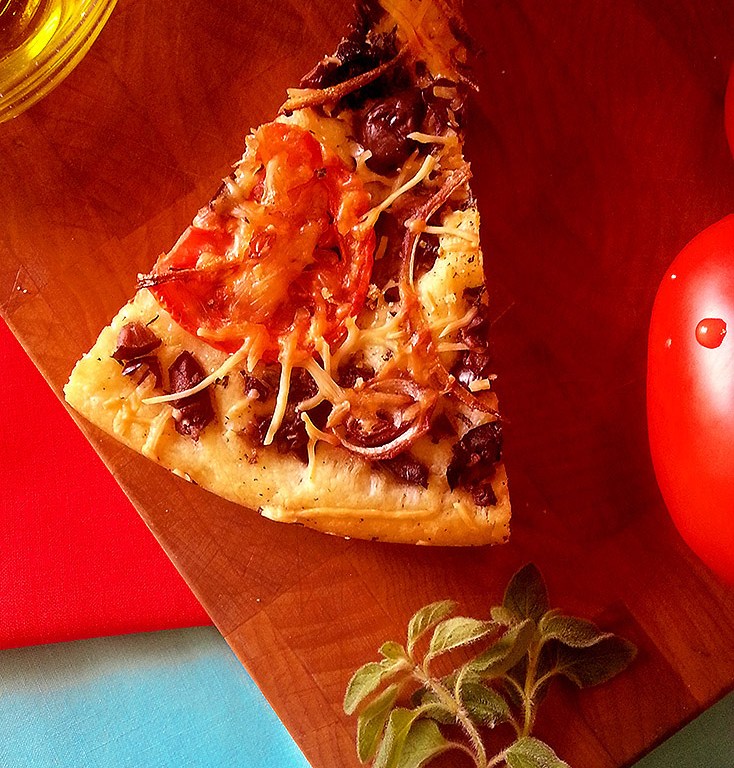 Sprinkle on a good amount of salt and black pepper, followed by the oregano and chopped olives. Lay on the tomato slices, followed by the onion and the cheese. Bake in your preheated oven for 30-40 minutes, or until the dough is lightly golden brown on top and springs back when touched in the center of the pan, and the cheese has browned.